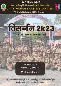 The closing ceremony for the 2022–23 batch, ‘विसर्जन- 2k23′ was held on 16 June 2023, Friday, from 2.00 to 4.00 pm at CH Auditorium. The welcome speech was given by Lt. Loosiya KP, Associate NCC Officer. The inaugural address was given by Prof. (Dr.) Muhammed Basheer Ummathur, College Principal. The felicitation was given by Capt. Dr. Meeradevi AC, Retd. Associate NCC Officer. She explained the opportunities and scope of NCC cadets in the Indian Army and several state and national-level competitive exams.The vote of thanks was delivered by Under Officer Ayisha Anaina. PK. After the official session, there was a video presentation and a small present for the senior cadets as a token of gratitude. Senior cadets of the 2020–23 batch shared their experiences of being in the NCC and the great change they went through. Cultural programmes were done by second-year cadets. After that there was a photo session and a tea party. The programme ends with the NCC song and National Anthem.