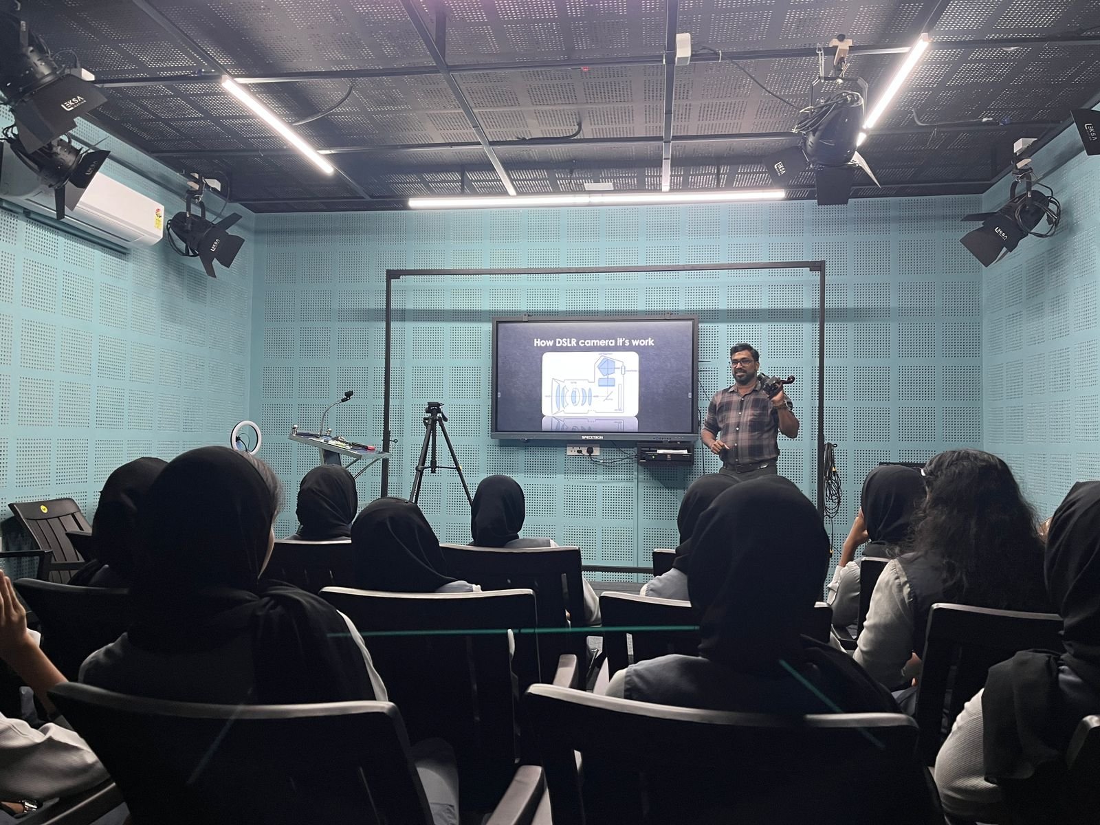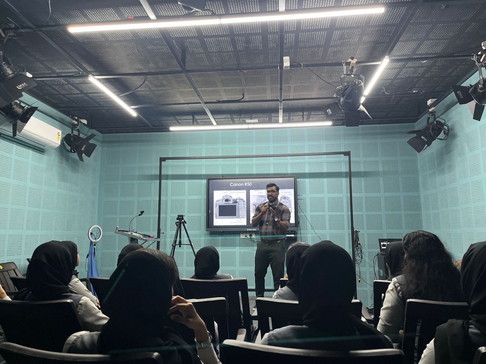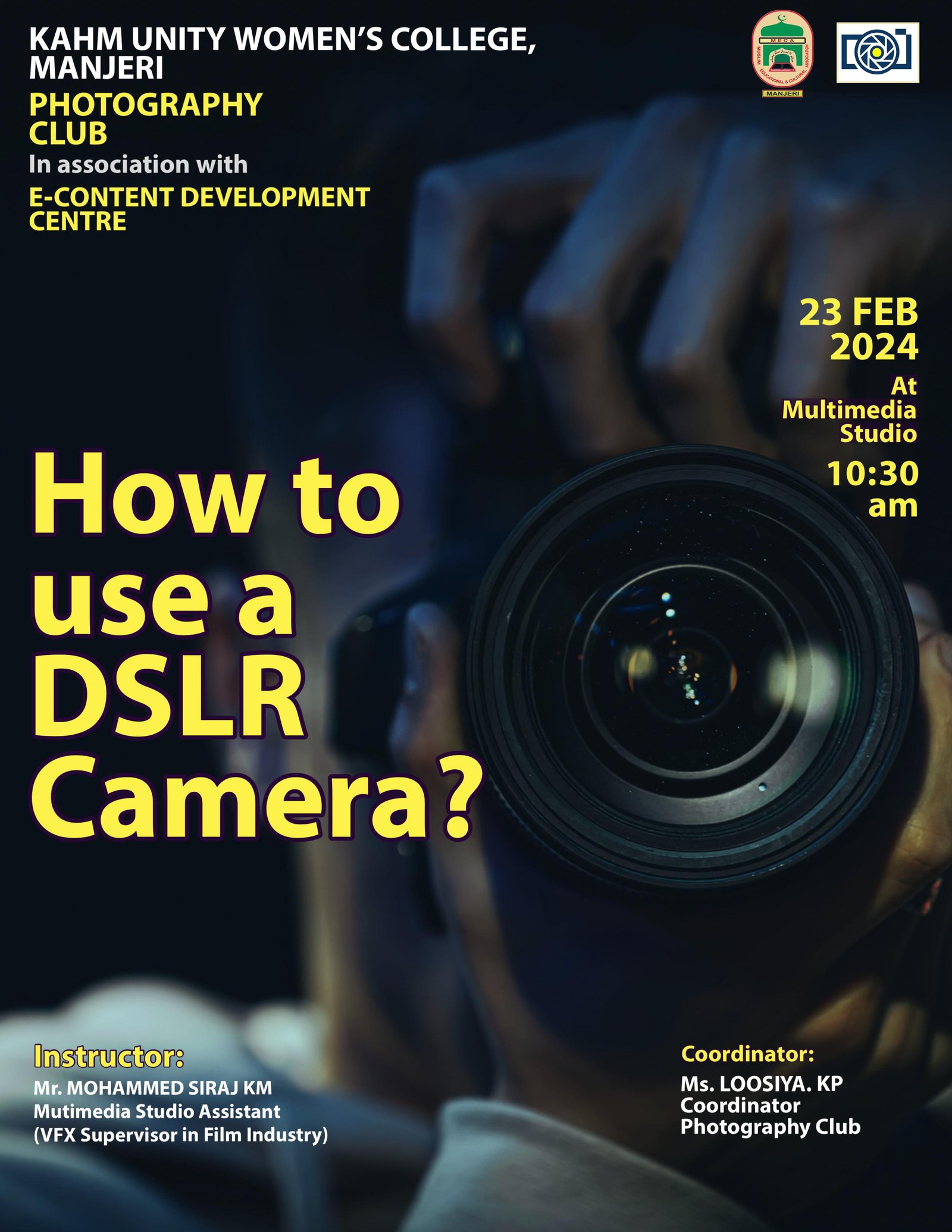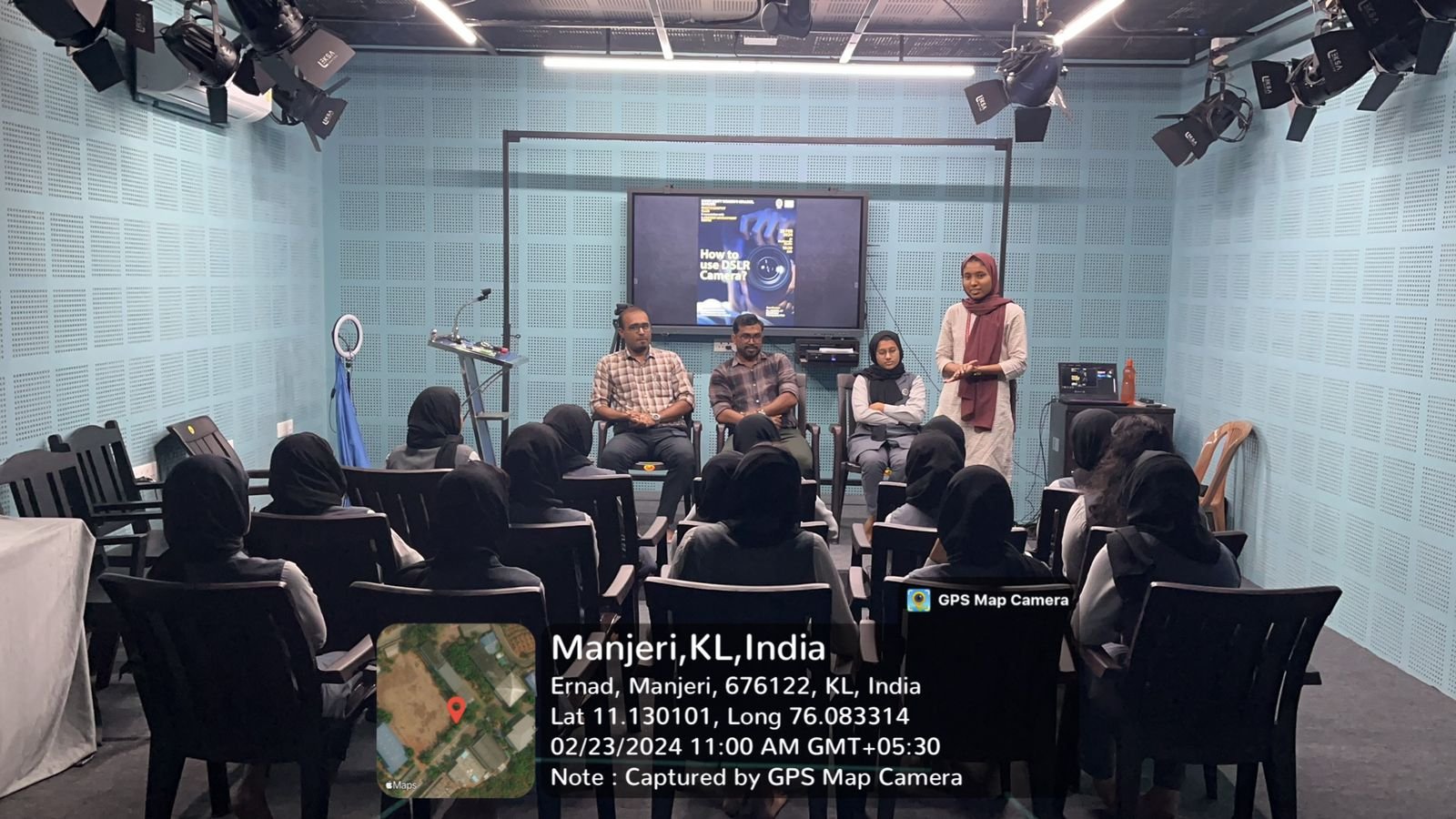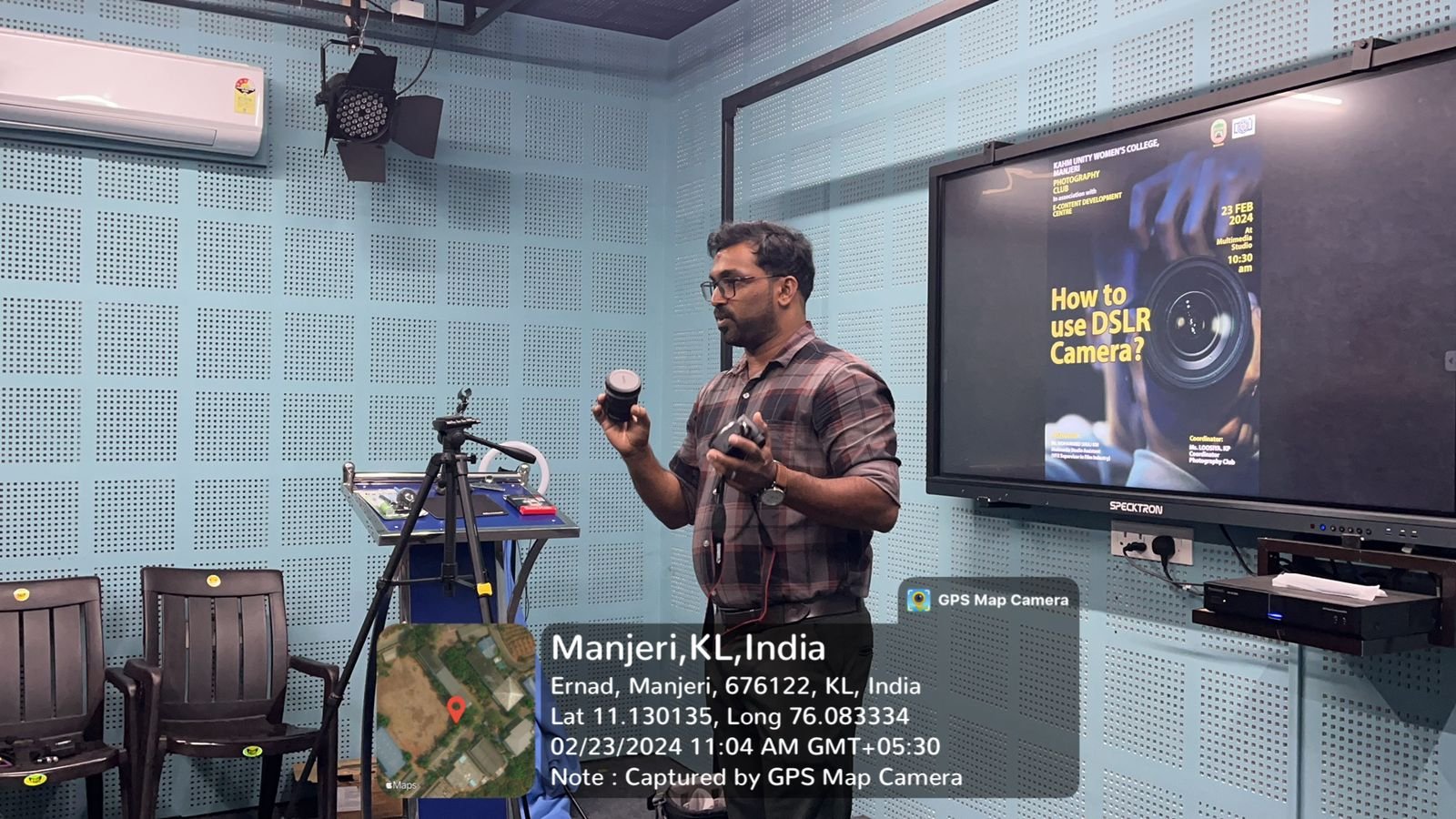 ‘How to use a DSLR Camera?’ Photography Club 23 Feb 2024 ———————————————- The photography club, in association with the E-development center organized a session on ‘How to Use a DSLR Camera?’ on 23rd February 2024 at Multimedia Digital Studio. The resource person for the session was Mr. Mohammed Siraj KM, Multimedia Studio Assistant and VFX Supervisor in the film industry. He explained the working principle of a camera, features of the Canon R50, different lenses used for photography, equipment used for photography, etc. The session started with a welcome speech delivered by Ms. Loosiya. KP, Photography Club Coordinator. A total of 20 students participated in the session. Mr. Haris. U, Assistant Professor, Department of Computer Science, also joined in the session. The session ended with a vote of thanks given by Ms. Amna (4th Sem BSc FCS), President of the Photography Club.