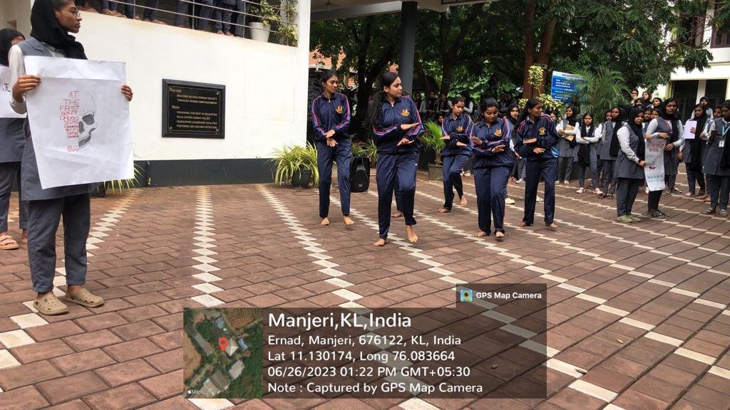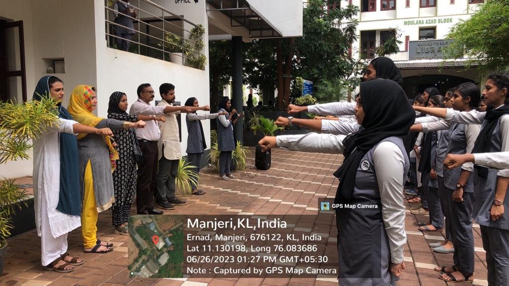 NCC Army Wing ,KAHM UNITY WOMEM’S COLLEGE, MANJERI 9 (K) Girls Battalion, NCC, Kozhikode .The NCC Army Wing observed ‘ International Day against Drug Abuse and Illicit Trafficking’ on June 26, 2023, by playing a flash mob based on the theme ‘People first: stop stigma and discrimination, strengthen prevention’. The main aim of this day was to strengthen action and cooperation in achieving a world free of drug abuse. The programme was inaugurated by College Principal Prof. (Dr.) Muhammed Basheer Ummathur. Lt. Loosiya KP, NCC Officer, welcomed the gathered. After the flash mob, cadets displayed posters, and all cadets took the pledge to “Say Yes to Life and No to Drugs” given by the Ministry of Home Affairs, Government of India. Cadets got an e-certificate for the pledge. UO Ayisha Risni. K, 5th Sem BSc Psychology, delivered the vote of thanks. UO Shana Buhaisa. P (5th Sem BSc CS) and Lt. Loosiya KP were the student and faculty coordinators, respectively.