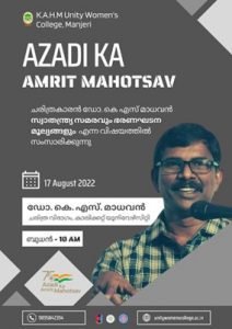 75th Independence Day Celebrations at KAHM Unity College Manjeri was inaugurated by Dr. K. S. Madhavan, the renowned historian and public intellectual who took the audience on an awakening and enlightening journey to the spirit of freedom and independence, highlighting the concept of “Swaraj” as envisioned by legendary leader like Jawaharlal Nehru, Mahatma Gandhi, B. R. Ambedkar and the like. He highlighted that the constitutional values such as secularism, justice and cultural inclusiveness must be upheld in the wake of 75th Independence day celebrations. Chief guest of the day Dr. K. S. Madhavan inaugurated the Azadi Square and visited the Freedom Wall. Sri. O. Abdul Ali, College manager, declared the winners of the Freedom Wall Painting. Er. Abdul Ali, Manager, Dr. A K. Shahina Mol, IQAC Coordinator, Ms. Jaseena, Staff Secretary, Mr. Basheer Hussain Thangal, Non teaching staff representative, and Mr. Musthafa, PTA Vice president felicitated the programme. The inauguration was followed by cultural events and competitions including Elocution Competition, patriotic song, Tableau, Quiz Face painting, fusion dance and Cultural Mix Dance performance by the members of EBSB Club. IQAC, Department of History, Arts Club, EBSB Club, NCC, NSS and students from all departments added special flavour to the occasion with multiple events that promoted the theme of national integration. Mr. Shabeer Mon, HoD of History, formally welcomed the gathering and Mr. Siddhique, Convenor of Arts Club, rendered the vote of Thanks.