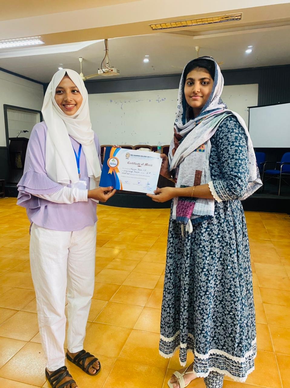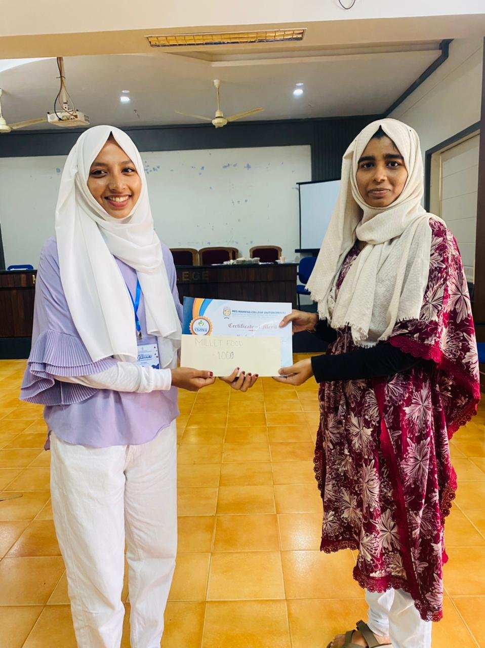 Ms.Majida M and Mrs.Noufiya Thasni C.P., I sem MSc. Home Science ( Nutrition and Dietetics) won first and second prize with cash award in Inter- College Millet Food Preparation Competition conducted by Dept. of Nutrition and Dietetics,MES Mampad College on 13/09/2023.