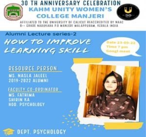 Department of psychology conducted 2nd alumni lecture series on 23 rd. September 2022. The session handled by MS Nasla Jaleel (2019-2022 alumni) on the topic How to improve learning skills. 50 students participated in the session