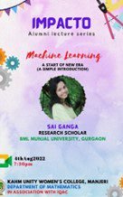 The first session of IMPACTO- Alumni Lecture Series was conducted on Thursday, 4th August 2022. The session was handled by Miss. Sai Ganga, Research Scholar, BML Munjal University, Gurgaon, who is an Alumna of the Mathematics Department (2014-2017 batch). She gave a talk on Machine Learning, its application, impact and the need in the contemporary world.
