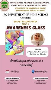 As a part of World Breast Feeding Week celebration , the PG department of Home science organised an Awareness Class on the Significance of Breast Feeding on 4th August 2023 at B108, APJ Abdul Kalam Block. The awareness class was taken by Ms Farzeen, II M Sc Home Science (Nutrition & Ditetics). The session included the benefits of breast feeding, lactating positions, diet and care during lactation. Lactating, pregnant and other interested students of various departments participated in the session and clarified their doubts. The programme was cordinated by the faculty coordinator Dr. N.V. Fatimathu Zuhara, Assistant Professor and the student coordinator Ms.Riyana Nimshu, II M Sc Home Science (Nutrition & Ditetics)