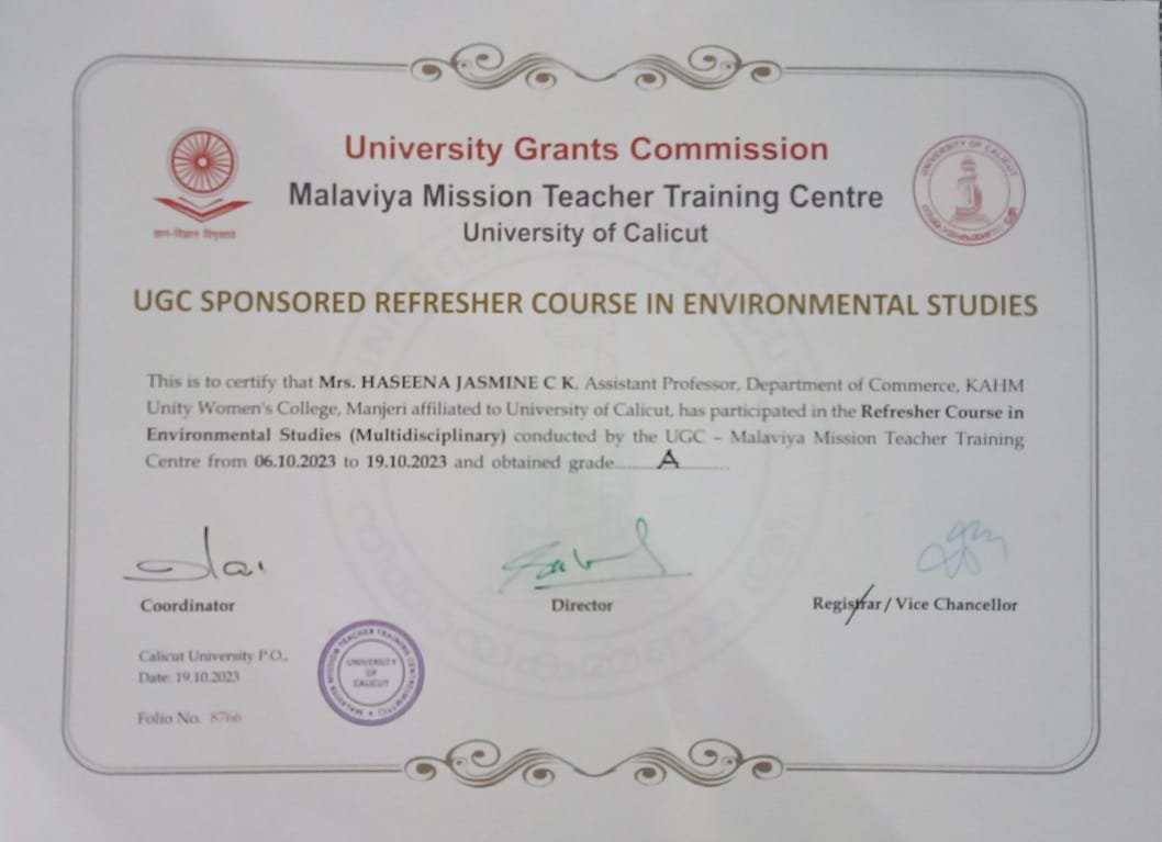 Haseena Jasmine CK, Assistant Professor, the Department of Commerce, recently attended a UGC sponsored interdisciplinary refresher course In Environmental Studies at the University of Calicut. The programme was conducted by the UGC – Human Resource Development Centre from 6th October 2023 to 19th October 2023.