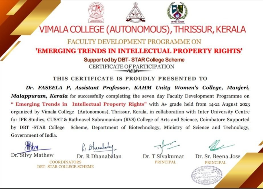 Dr. Faseela P, Department of Botany, attended One Week Faculty Development Programme (online mode) on Emerging Trends in Intellectual Property Rights from 14/08/2023 to 21/08/2023, organized by Vimala College, Thrissur, Kerala, in collaboration with Inter University Centre for IPR Studies, CUSAT & Rathnavel Subramaniam (RVS) College of Arts and Science, Coimbatore supported by DBT -STAR College Scheme, Department of Biotechnology, Ministry of Science and Technology, Government of India.