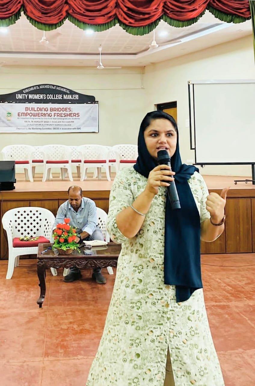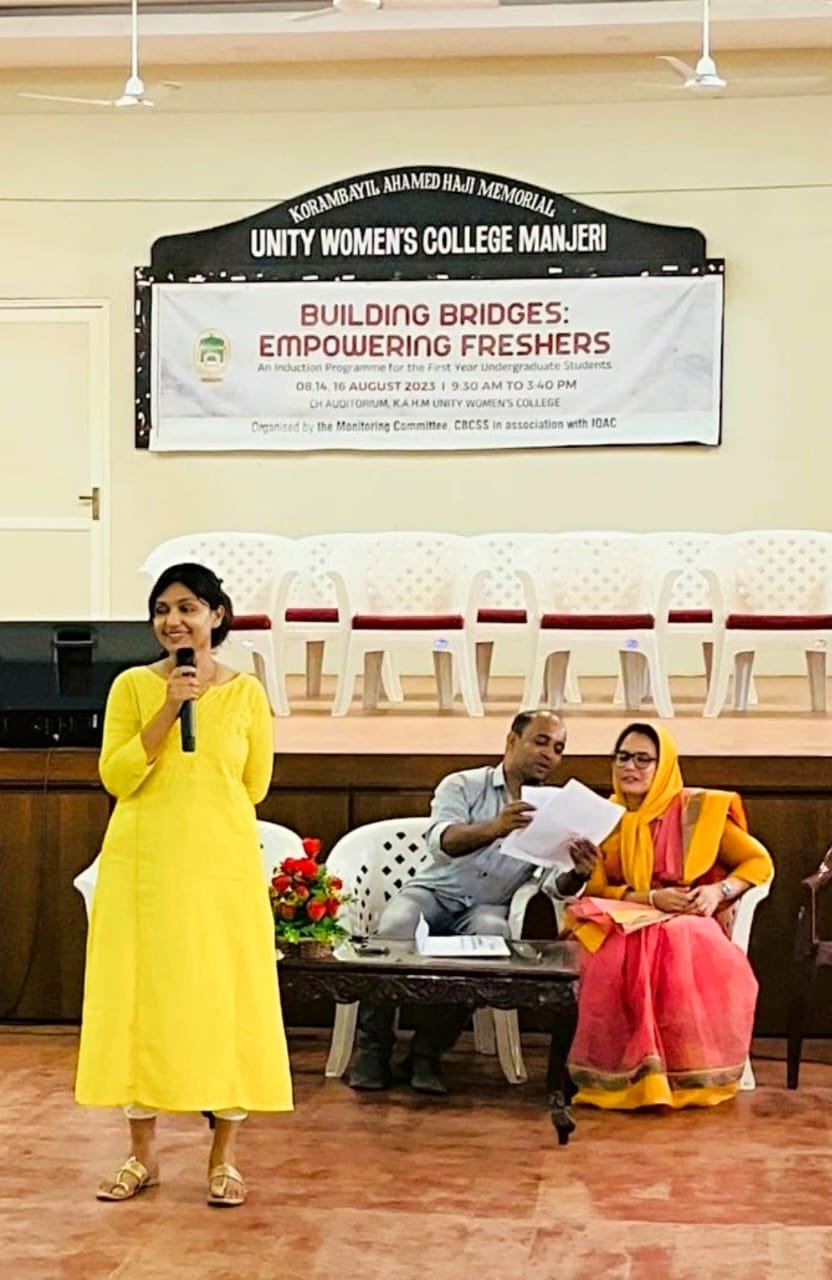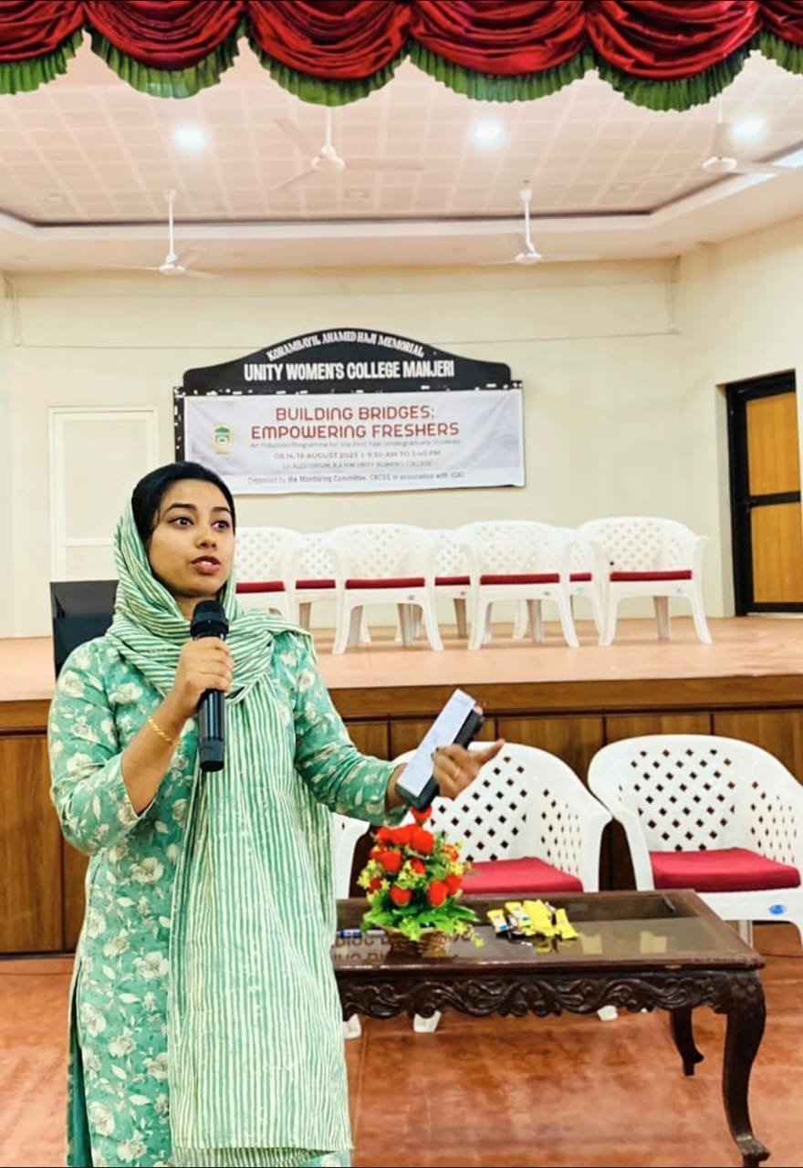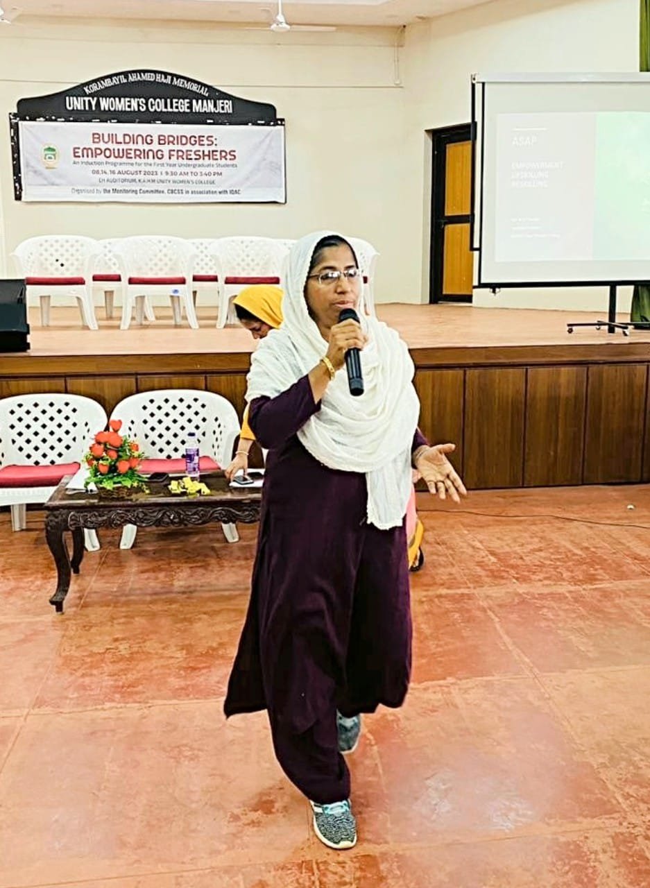 On the second day of the Induction programme for first year Undergraduate Students at KAHM Unity Women’s College, Manjeri, organised by the CBCSS Monitoring Committee in association with IQAC, a series of insightful sessions were held on 14th August, 2023, at the CH auditorium. The sessions covered a diverse range of topics, including IQAC’s role in ensuring academic quality, the resources and services offered by the Library, essential Office Services, and the opportunities provided by the Tourism Club. Additionally, the students were introduced to the Additional Skill Acquisition Programme (ASAP), Scholarship opportunities, student Welfare initiatives, and the various Club activities available in the campus. The sessions also touched upon the AUDIT Course and Moodle Learning Management System (LMS), along with details about the EBSB and Certificate Courses and a glimpse into the upcoming Fresher’s Day celebrations. The sessions provided valuable information and guidance to the students, empowering them with knowledge and resources to navigate their academic journey effectively.