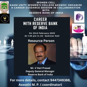 Women Cell, KAHM Unity Women’s College, Manjeri organizes a career guidance session in collaboration with the Reserve Bank of India. The session will be held on 23rd February 2023 at 1.30 pm. Mr. V. Hariprasad, Deputy General Manager of RBI is the resource person.