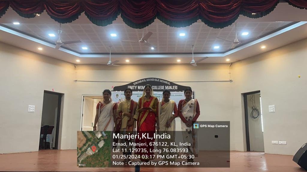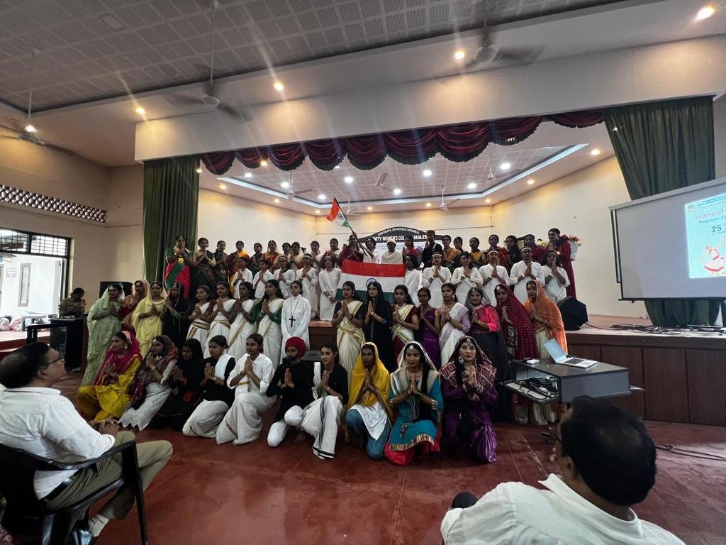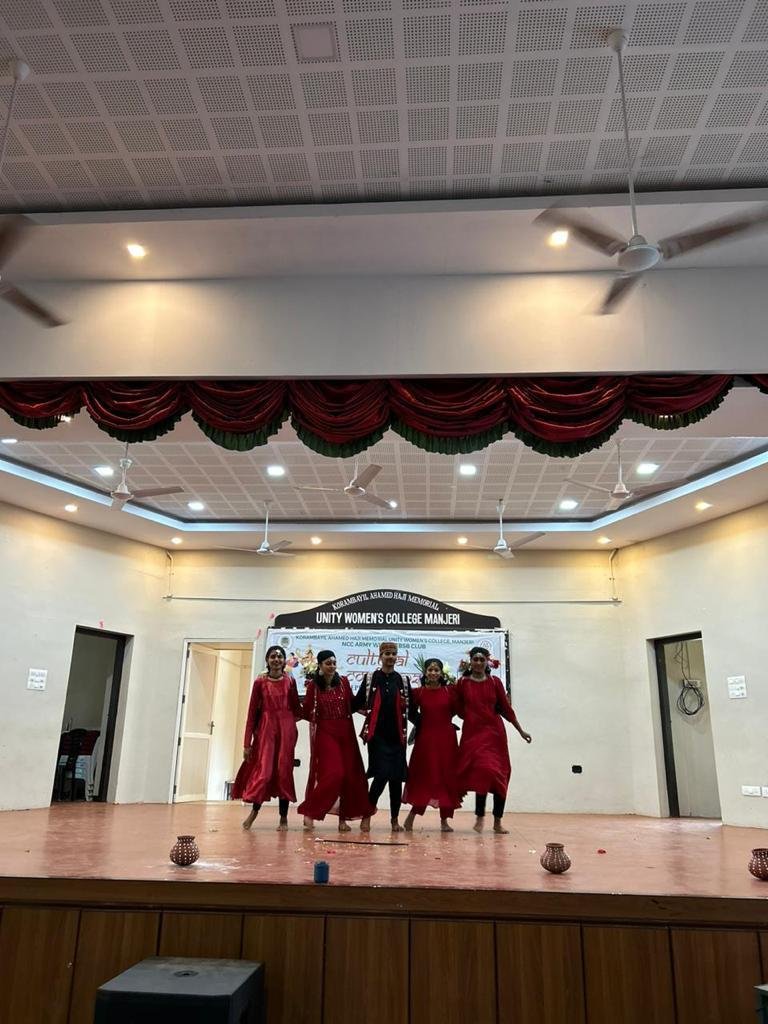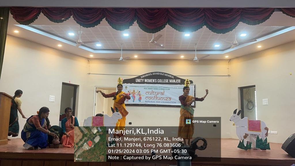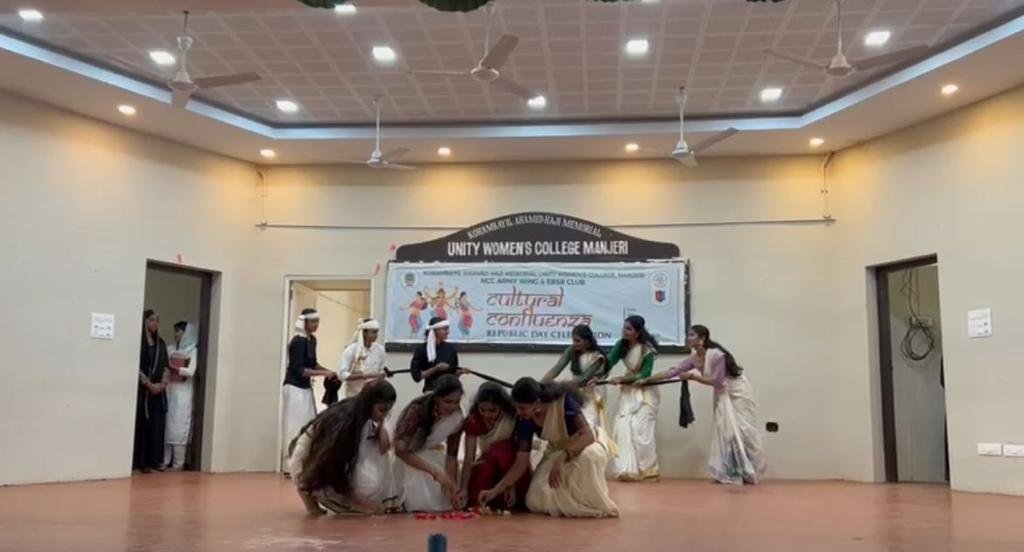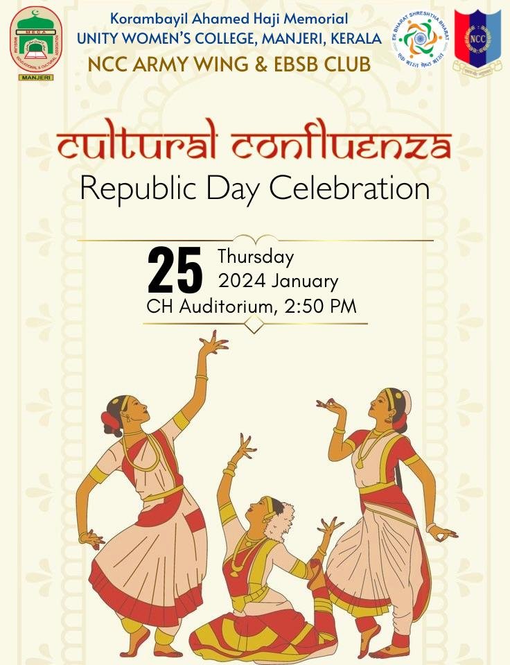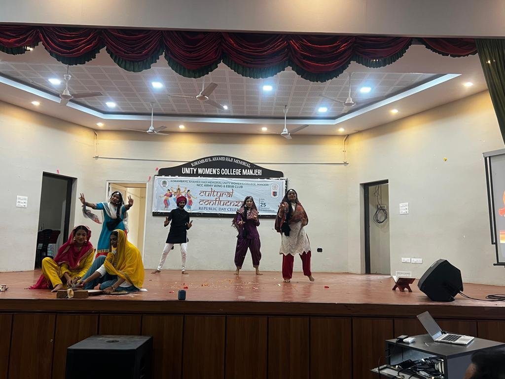 Cultural Confluenza Republic Day Celebration 2024 ——————————— The NCC Army wing and EBSB Club of the college jointly organised a “Cultural Confluenza” as a part of the Republic Day celebration on 25th January 2024 at CH Auditorium. The Principal, Prof. (Dr.) Muhammed Basheer Ummathur delivered the Republic Day message addressing the students as the nation builders and wished them to be responsible citizens upholding the values of our constitution for the betterment of society. The culture and traditional folk dances of various states such as Kerala, Tamil Nadu, Rajasthan, Himachal Pradesh, Punjab and West Bengal were showcased in the event. Following the cultural display, a patriotic dance drama, depicting the sacrifices made by our freedom fighters for free India was also exhibited. The cultural confluence reinforced equality, unity in diversity and patriotism among the students and staff. The programme came to an end with the national anthem.