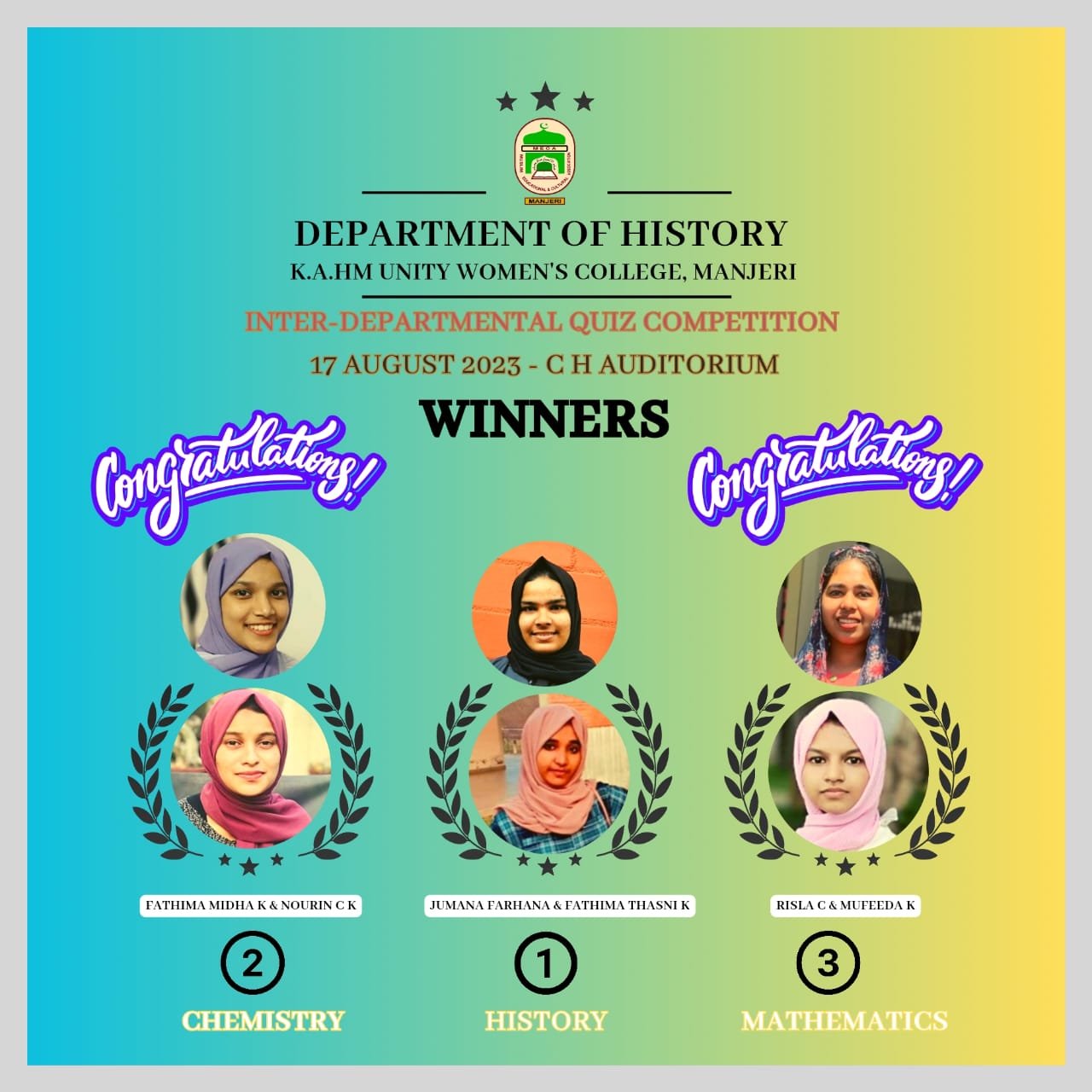 On August 17, 2023, the Department of History, Korambayil Ahamed Haji Memorial Unity Women’s College, Manjeri organized an Inter-departmental Quiz competition at CH auditorium. The competition revolved around the Indian Independence Movement from 1885 to 1947 and attracted participation of seven teams representing five departments, including BSc Chemistry, BSc Mathematics, BSc Psychology, BA History and B.Com Computer Application. The competition took place at 2:30 PM and showcased the teams knowledge and enthusiasm for the topic. After a rigorous session, the History Department emerged as the winners, securing the first prize. The Chemistry Department clinched the second prize, while the Mathematics Department claimed the third prize. The event was organised as a part of the 77th Indian Independence Day Celebrations.
