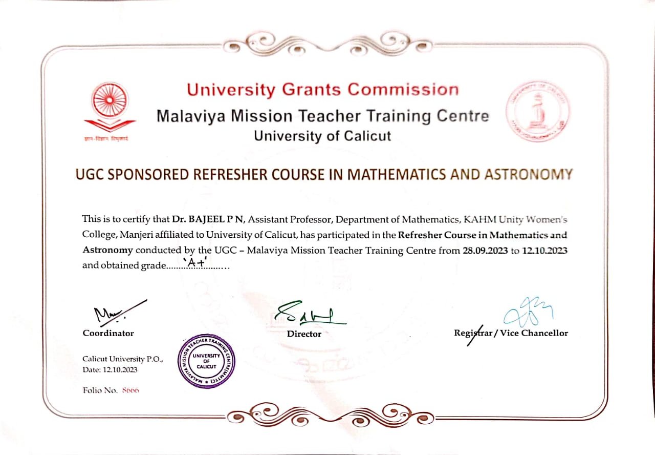 Dr. Bajeel P N, a faculty member in the Department of Mathematics, recently attended a UGC sponsored interdisciplinary refresher course Mathematics and Astronomy at the University of Calicut. The programme was conducted by the UGC – Human Resource Development Centre and took place from 28th September 2023 to 12th October 2023.