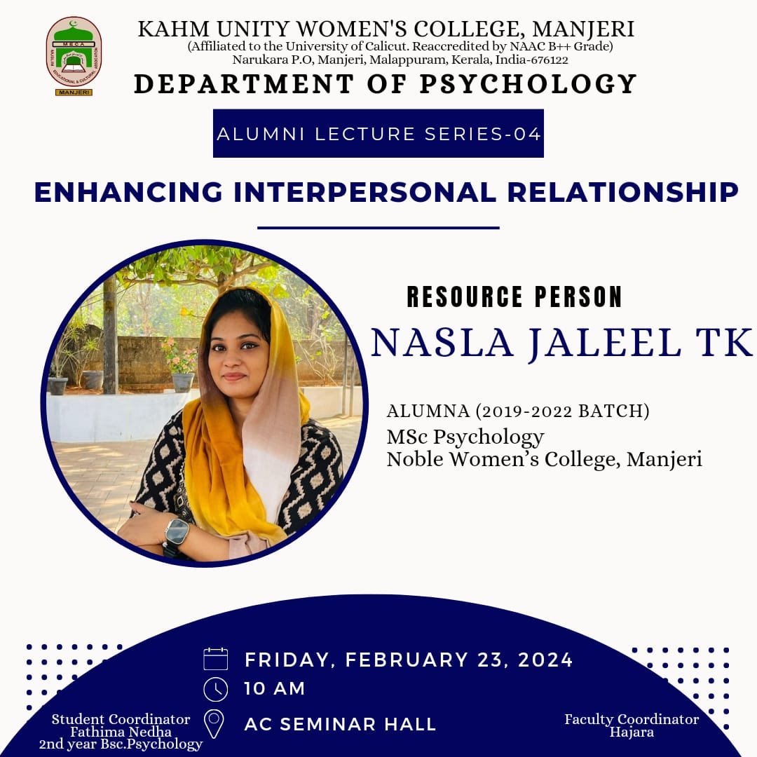 The Department of Psychology hosted an alumni lecture on 23rd February, 2024, at 10:30 am, at the AC seminar hall on the topic “Enhancing interpersonal relationships.” The session was led by Nasla Jaleel T K, an alumna from the 2019-2022 batch, who is currently pursuing an MSc in Psychology at Noble Women’s College, Manjeri. Nasla shared valuable information’s and strategies drawn from her academic and personal experiences to help attendees cultivate better connections with others. The lecture provided valuable perspectives on communication, empathy, and conflict resolution, enriching the audience’s understanding of interpersonal dynamics. Overall, it was a fruitful and engaging event that benefited both current students and alumni.