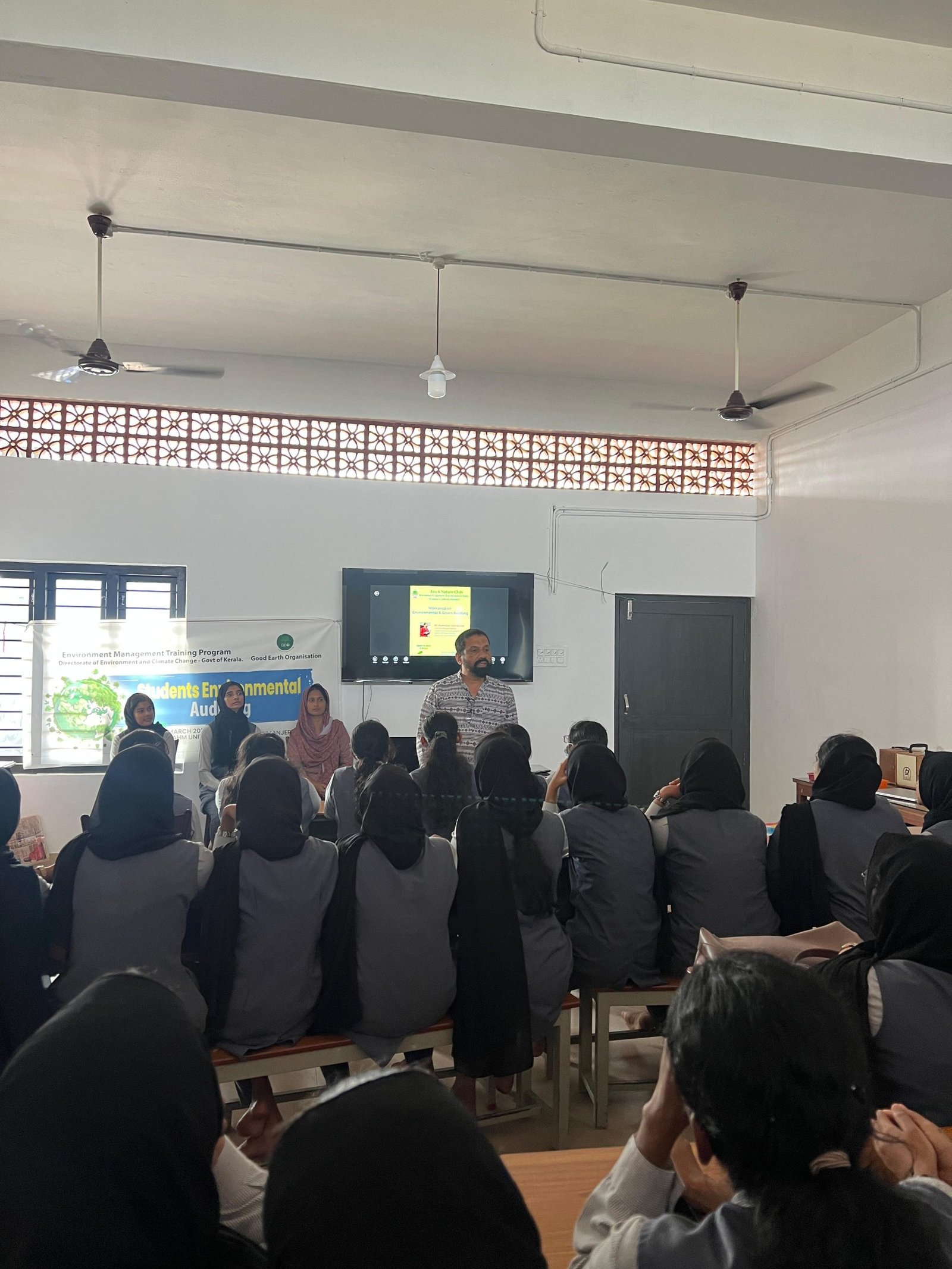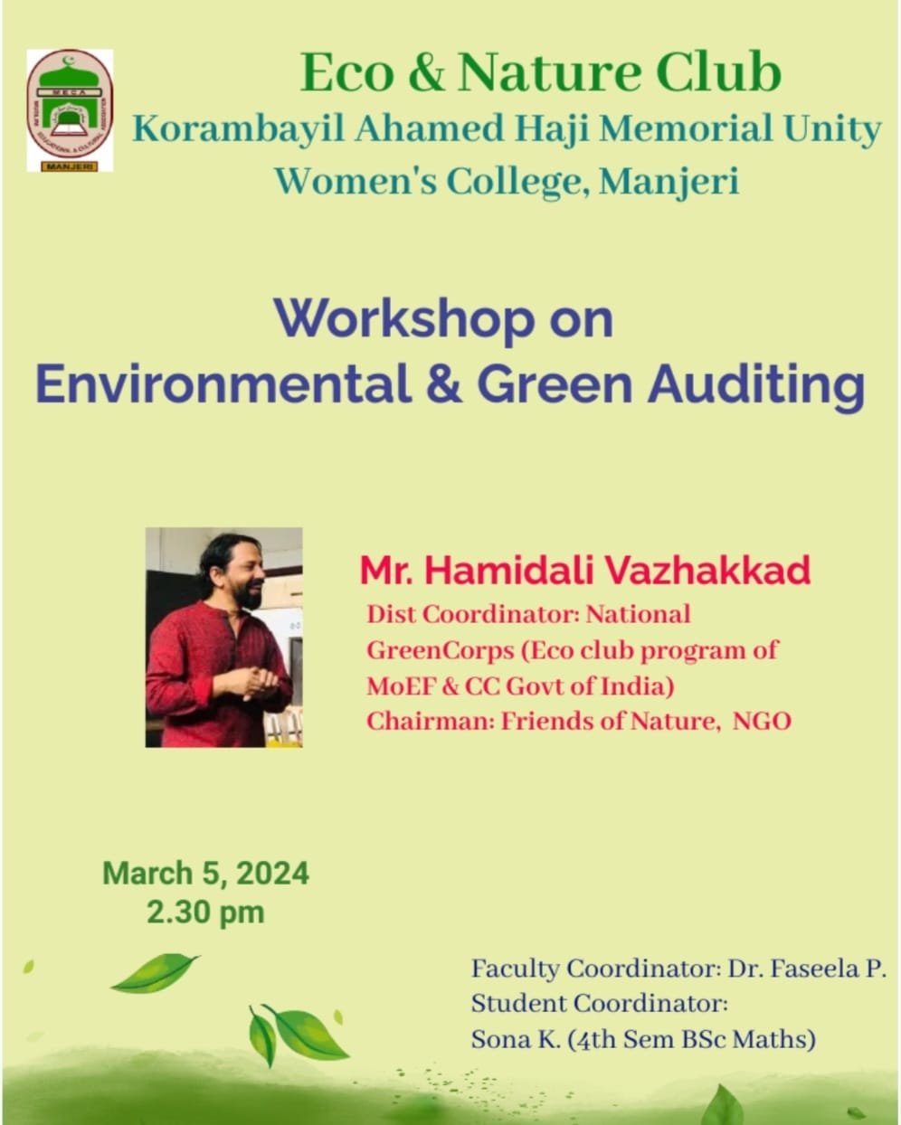 Eco and Nature Club, KAHM Unity Women’s College, Manjeri, organized a workshop on Environmental and Green Auditing on 5th March 2024 as part of Environmental Training Management Program. The event, conducted in collaboration with the Directorate of Environment and Climate Change, Govt of Kerala, and Good Earth Organization, aimed to enhance environmental awareness and sustainable practices. Mr. Hamidali Vazhakkad, a distinguished environmentalist, served as the resource person, elucidating various protocols for green and water auditing at the college site. The participants actively engaged in the program, with 35 club members exploring the auditing sites on campus. This initiative not only fostered ecological consciousness but also underscored the importance of practical, on-site environmental stewardship. The program coordinated by Dr Faseela P and Sona K (4th Sem BSc Maths).