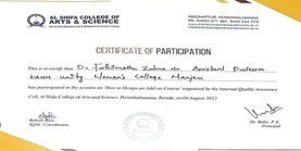 Kerala. Dr.N.V. Fatimathu Zuhara, Assistant Professor in Home Science participated in the session on “How to Design Addon Courses”, organised by the IQAC, Al Shifa College of Arts& Science, Perinthalmanna, Kerala, on 4th August 2022.