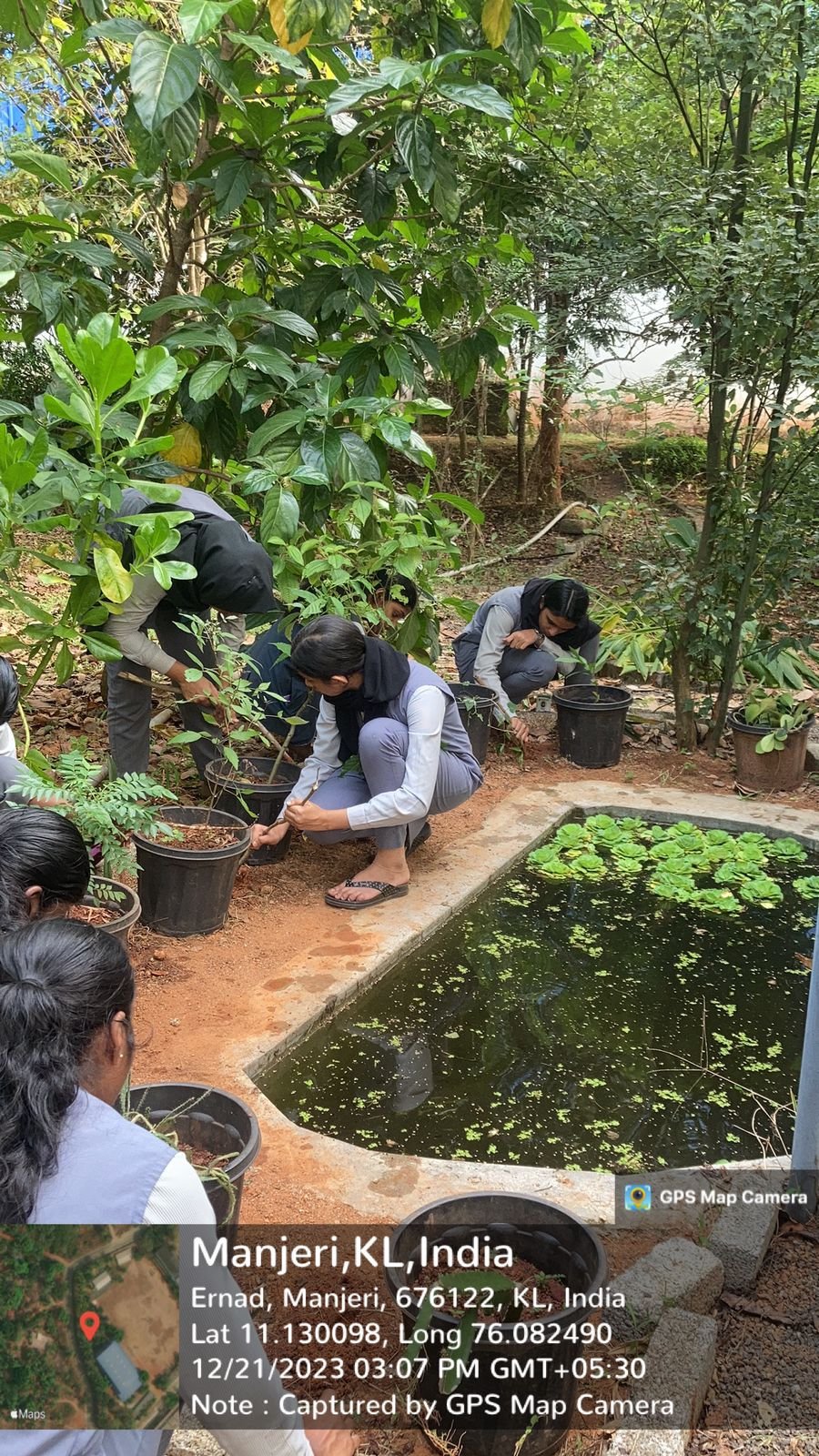 The Biodiversity Club Board prepared as per the format given by Kerala Biodiversity Board, Thiruvananthapuram, Kerala and fixed in the campus. As the second activity, the club initiated the work of ‘Biodiversity Spot’ in the campus that conserves the germplasm of different plant groups including bryophytes, pteridophytes, gymnosperms and angiosperms in a single spot. The plants of various habitats like aquatic, epiphytic and terrestrial, play major role in the diversity conservation of the spot; similarly, fauna of the pond also contributes equal role in aquatic ecosystem balance together with plant species, Pistia and Lemna.
