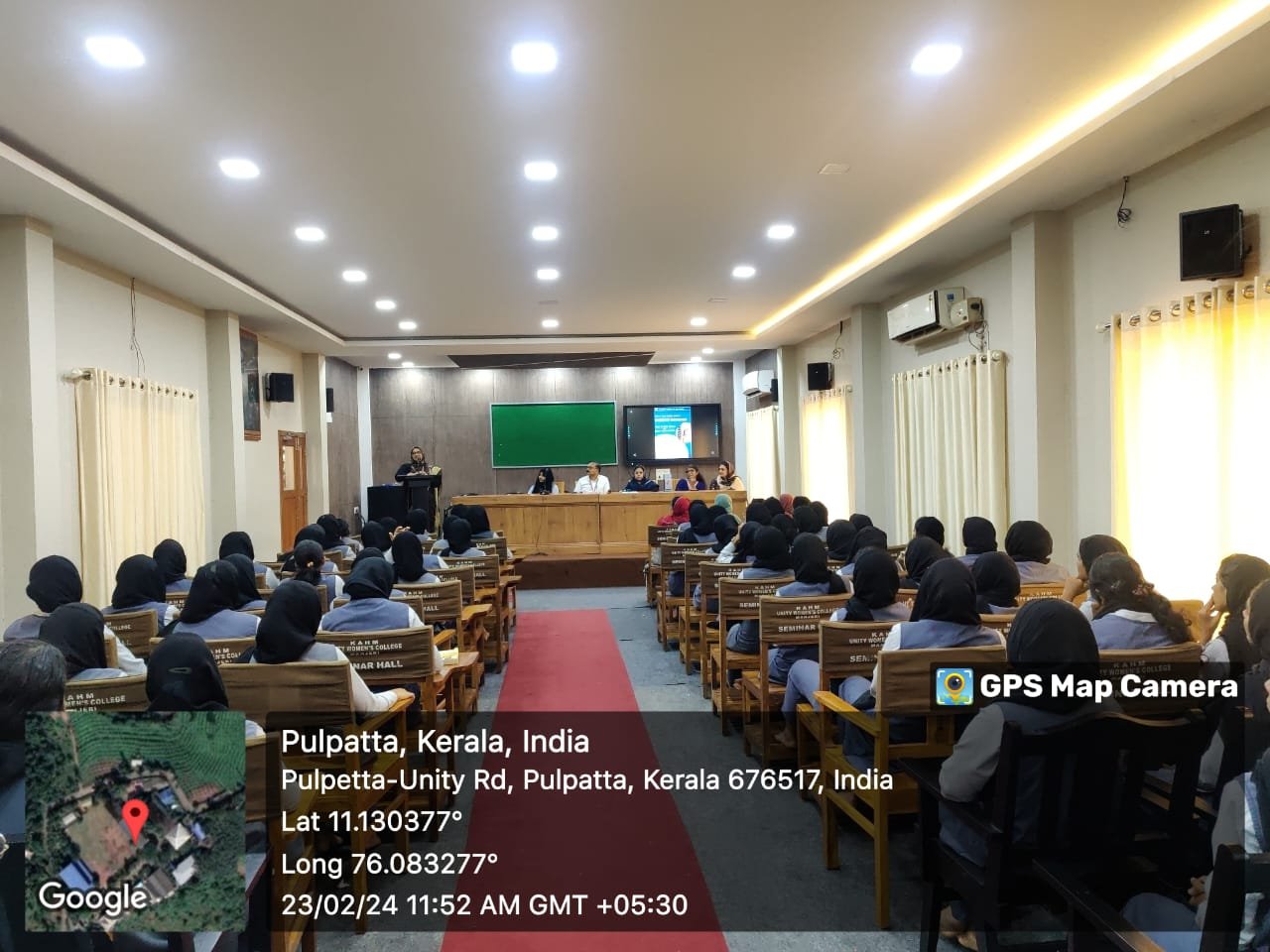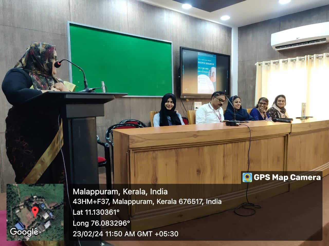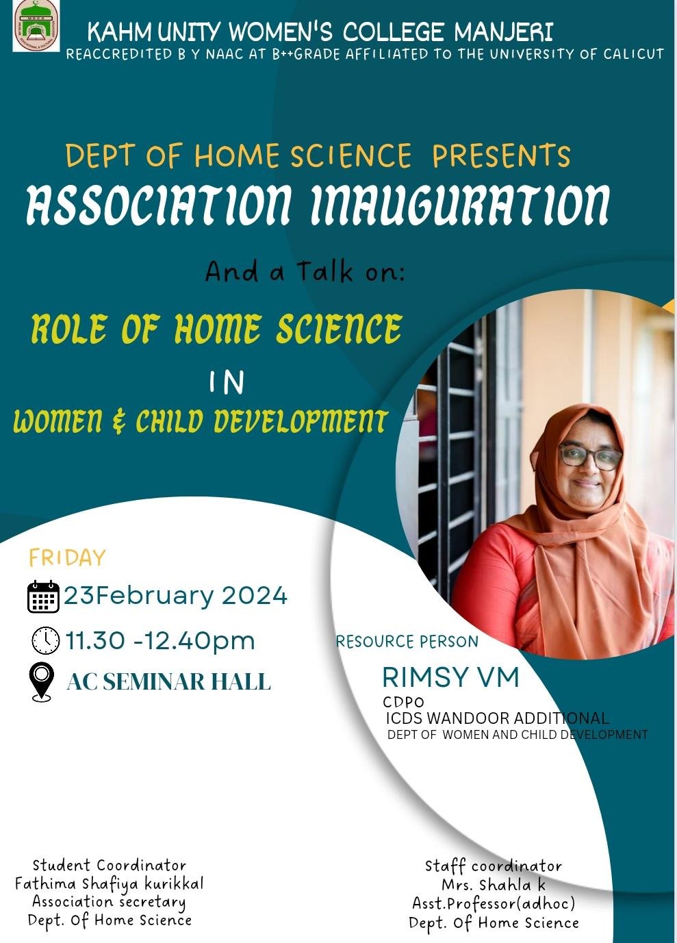 Home Science Association Inauguration 2024-25 23 February 2024 ——————————————- Department of Home Science Association was Inaugurated on 23rd February 2024 by Mrs,Rimsy V.M.(Alumna),CDPO,Wandoor. She also delivered a session on the topic ‘Role of Home Science in WCD’. The session offered the importance of Home Science subject in Women and Child Care Department for Implementing various programs to improve women’s access to healthcare, prenatal care, and nutritional support.The students got more information about the duties of CDPO and inspired them to get a job for self dependency and financial independence.The presidential address was given by The Principal,Dr.(Prof). Muhammed Basheer Ummathur and Key note address was given by Mrs Anitha Begum, Associate Professor and Head , Department of Home Science.The programme was coordinated by Mrs. Shahla K, Assistant Professor (Adhoc) and Mrs. Fathima Shafiya Kurikkal (IVth Sem BSc FCS)
