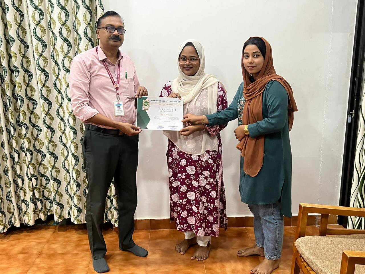 Handing over the certificates to students who completed their internship at Shihab Thangal Library and Information Centre as part of their BLISc course. Nabla K V and Riya Nourin M A have successfully completed 1 month internship at Shihab Thangal Library and Information Centre. Certificates were handed over by principal prof. Dr. Muhammed Basheer Ummathur