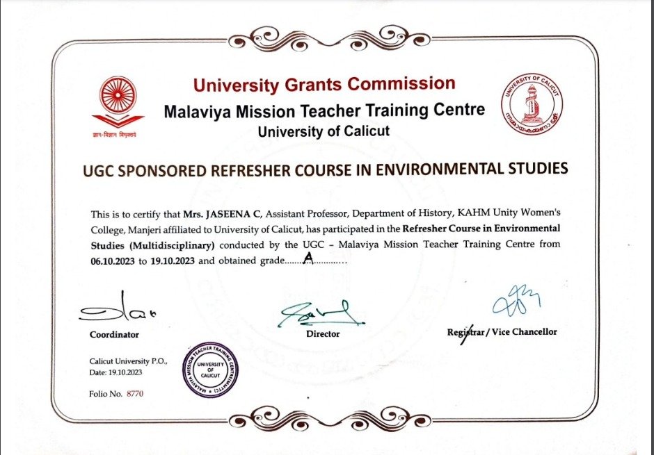 Jaseena C, Assistant Professor, the Department of History, recently attended a UGC sponsored interdisciplinary refresher course In Environmental Studies at the University of Calicut. The programme was conducted by the UGC – Human Resource Development Centre from 6th October 2023 to 19th October 2023.