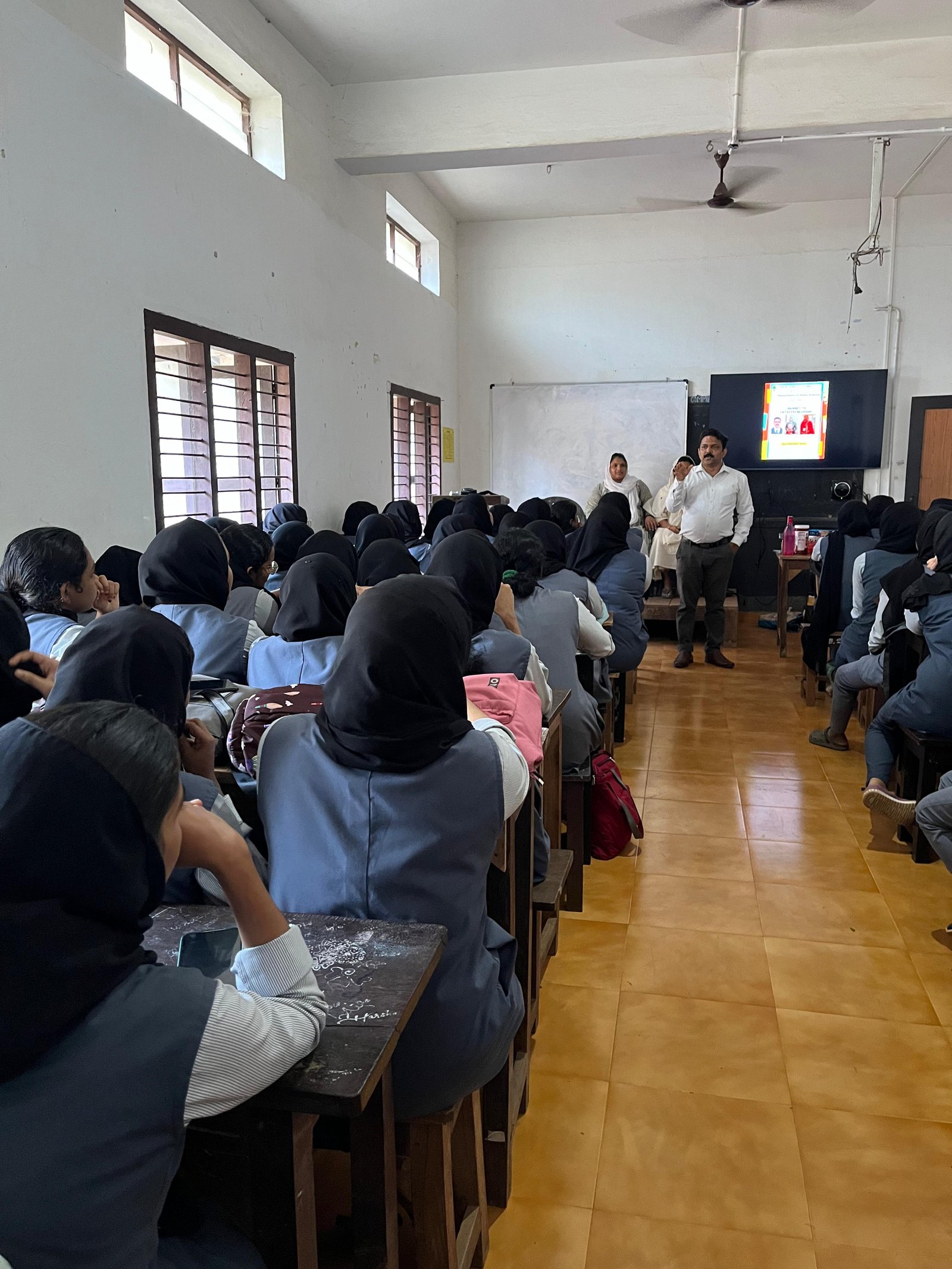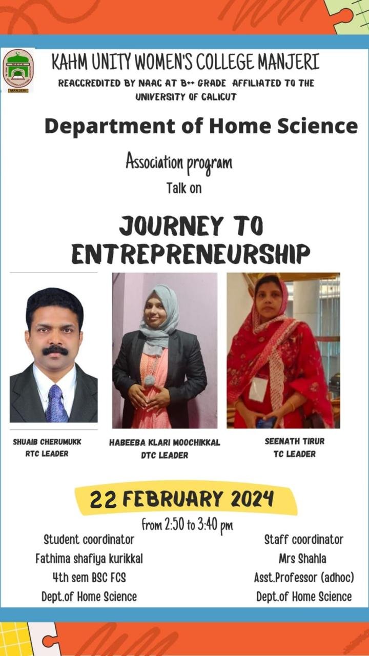 A session on ” JOURNEY TO ENTREPRENEURSHIP” 22 February 2024 ——————————————- As the part of association programme Department of Home Science Conducted a session on the Topic” Journey to Entrepreneurship”. The session was taken by Mr. Shuhaib Cherumukk, Regional Team Coordinator, MI Lifestyle Marketing Global Pvt.Ltd.The talk offered valuable insights into the challenges and rewards of starting a new business. The District Team Coordinator Mrs. Habeeba K and Mrs. Seenath shared their experience in their journey to entrepreneurship and taught students about development of a business plan.All Students of the Department participated in the session.The aim of the programme was to cultivate a mindset and skillset that empowers the students to identify opportunities, take initiative, and create value through innovation. The programme was coordinated by Mrs. Shahla K, Assistant Professor (Adhoc) and Mrs. Fathima Shafiya Kurikkal (student of 3 rd Sem Bsc FCS)