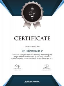 Dr. Hikmathulla V, Assistant Professor of Malayalam served as a jury for the Wafy Intercollegiate Magazine Competition held by the Wafy Students’ Federation (WSF) State Committee