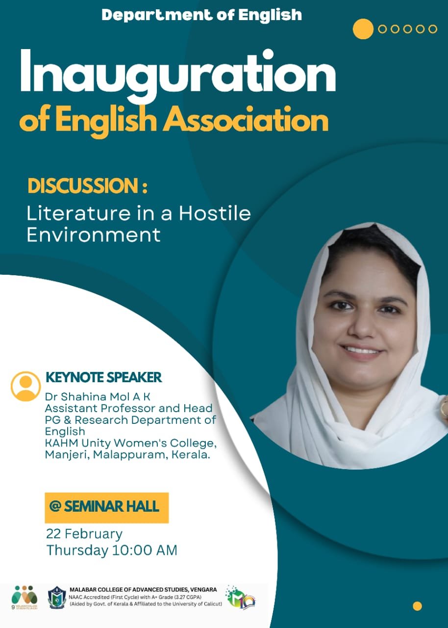 Dr Shahina Mol A K, Head , PG and Research Department of English inaugurated the English association of Malabar College of Advanced Studies, Vengara and delivered the keynote address on Literature in a Hostile Environment, on 22 February 2024