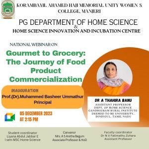 The PG department of Home Science and Home Science Innovation and Incubation Centre jointly organised a National Webinar on “Gourmet to Grocery: The Journey of Food Product Commercialization” on 05.12.2023 at 2.15pm through google meet. The webinar aimed at facilitating a deep understanding of the process of food product development and scaling up with precision for marketing. The webinar started with a short introduction of the event by the student coordinator, Ms. Liyana Abdul Jabbar, I M Sc Home Science (Nutrition & Dietetics). Mrs. A S Anitha Begum, Associate Professor & Head, Department of Home Science welcomed the participants. The webinar was inaugurated by the Principal, Prof. (Dr.) Muhammed Basheer Ummathur. Dr A Thahira Banu, Assistant Professor, Dept. of Home Science, Gandhigram Rural Institute- Deemed to be University, Tamil Nadu, delivered the keynote address, narrating the various steps involved in the scientific process of food product development and its commercialisation. She inspired the students by sharing her journey of transforming the ideas derived from the interaction with local people into income generating profitable food products. Being a patent holder, she also described the procedures and challenges associated with the procurement of a patent. Following the mind blowing session, students and staff interacted with the expert and clarified their doubts. There were around 84 participants in the webinar including the students and staff from various colleges both in and out of Kerala.The webinar concluded with the vote of thanks conveyed by the faculty coordinator Dr. N V Fatimathu Zuhara, Assistant Professor of Home Science.