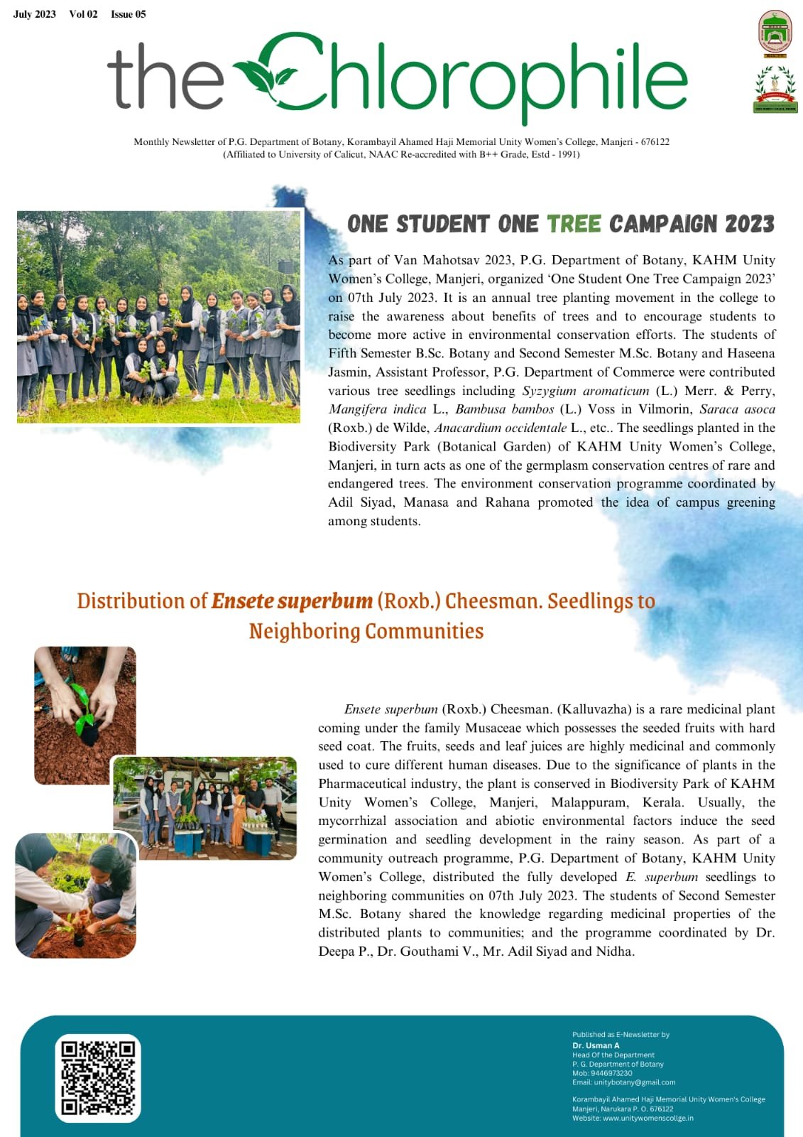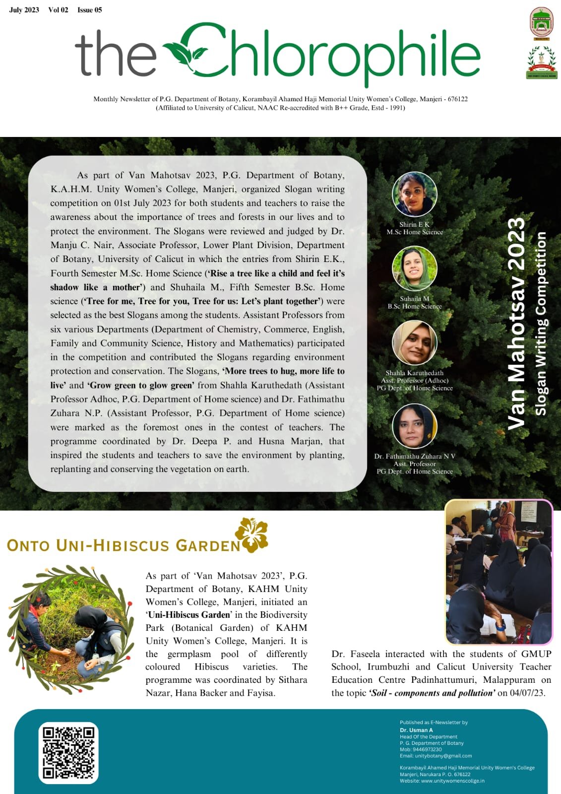 News letter, the Chlorophile (volume 02 , Issue 05) released by PG Department of Botany on 20th August 2023.