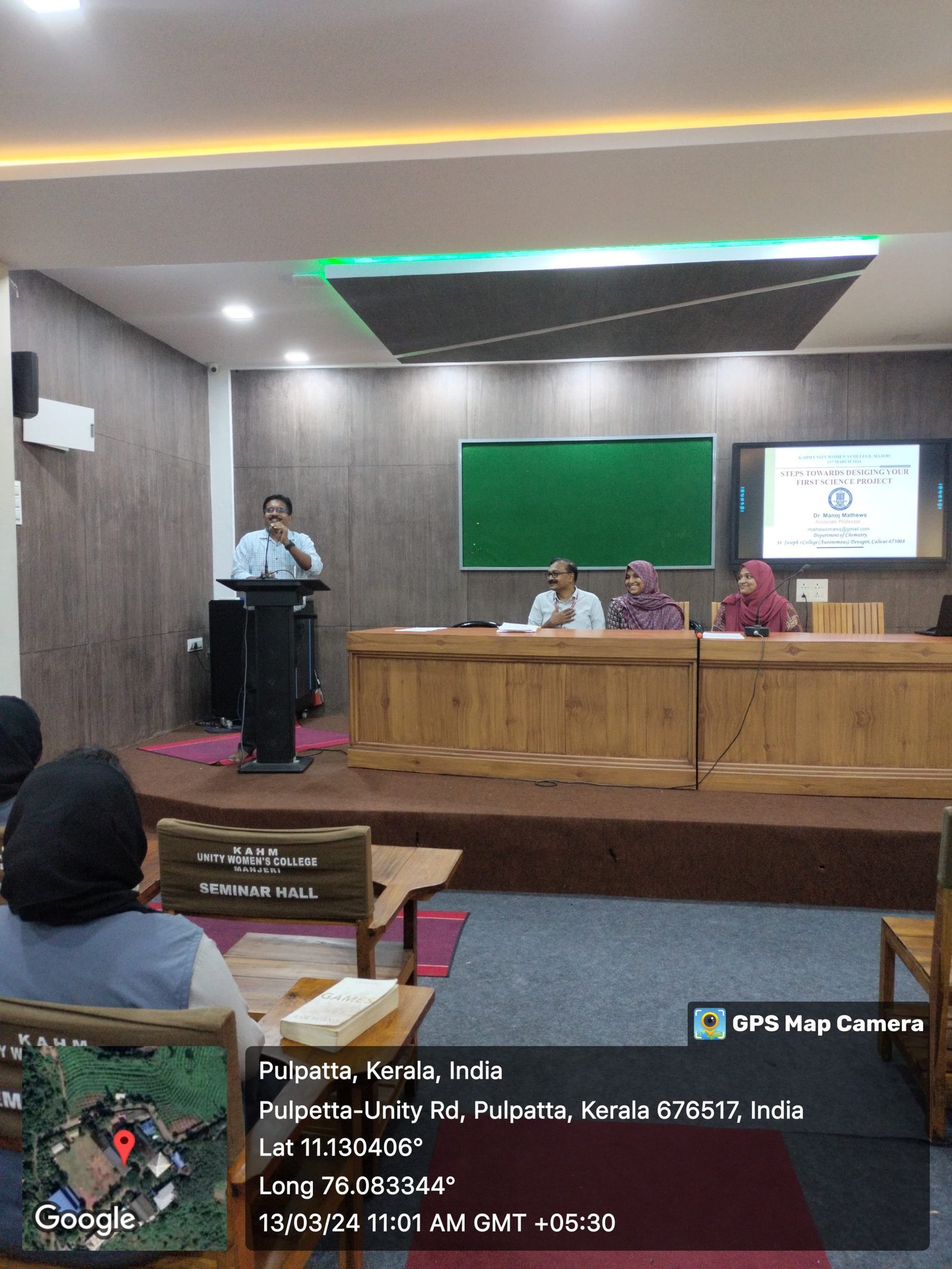 Department of Chemistry and the Science Club jointly organized a one-day seminar on 13th March 2024 at the AC Seminar Hall, commemorating Science Day. The seminar aimed to enlighten attendees on the topic “Steps towards designing your first science project”. Dr. Manoj Mathews, an Associate Professor from the PG and Research Department of Chemistry at St. Joseph College, Devegiri, served as the esteemed resource person for the event.The gathering commenced with a warm welcome from Dr. Jamsheena, Coordinator of the programme. Following this, Prof. (Dr.) Muhammed Basheer Ummathur, the Principal of KAHM Unity Women’s College, Manjeri, delivered an inspiring address, emphasizing the significance of scientific inquiry and innovation in today’s world. Throughout the seminar, Dr. Manoj Mathews shared valuable insights and guidance on the intricacies of embarking on one’s first science project. His expertise and experience offered attendees a comprehensive understanding of the essential steps and considerations involved in project design, encouraging budding scientists to pursue their scientific curiosity with confidence and purpose.The seminar concluded with Mrs. Suhada KM extending a heartfelt vote of thanks to all participants, speakers, and organizers for their contributions to making the event a success. Ms Omniyah Ummer, 4th sem BSc. Chemistry student was the student coordinator.