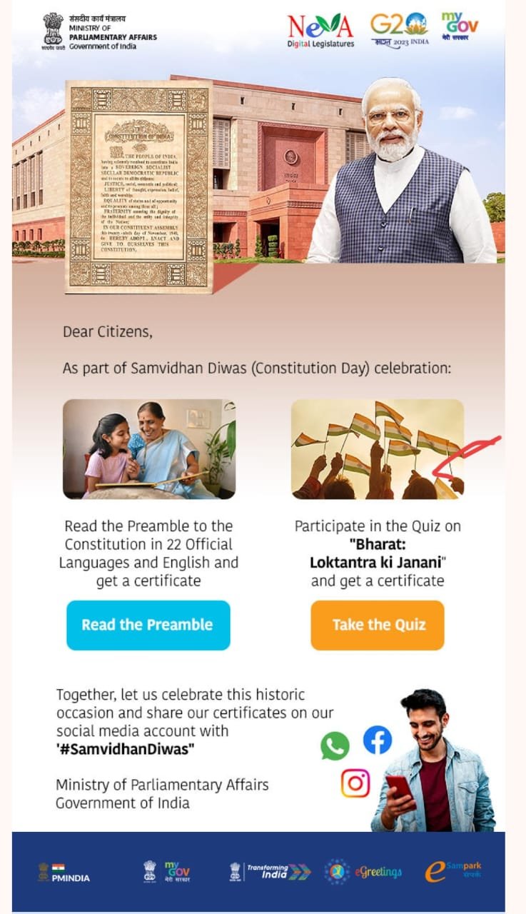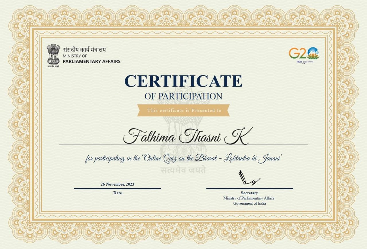 As part of the Samvidhan Diwas (Constitution Day) celebrations organised by the Ministry of Parliamentary Affairs, Government of India, the staff and students of the Department of History, K.A.H.M. Unity Women’s College, Manjeri, took part in an online quiz on “Bharat: Loktantra ki Janani” and the reading of the Preamble to the Indian Constitution on November 26, 2023. Four staff and 32 students were able to obtain participation certificates from the website of the Ministry of Parliamentary Affairs, Govt. of India