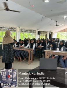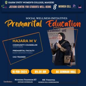 On Friday, February 16, 2024 a session on premarital education was conducted in the college by Women cell and Jeevani centre for students’ well-being. The session was handled by Ms.Hajara. M.V, Community Counsellor at district mission and premarital faculty at Minority Department of Kerala.