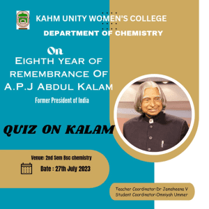 Department of Chemistry KAHM UNITY WOMENS’S COLLEGE MANJERI conducted a quiz programme on the occasion of A P J ABDULKALAM’s 8th year remembrance day on 27/7/2023. The teacher coordinator was Dr Jamsheena and the student coordinator was Ms. Omniyah. The competition was conducted by Ms.Omniyah. All students participated in the quiz competition. After the quiz programme, there was a discussion on Kalam’s book “wings of fire”.