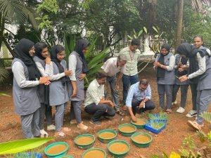 Rice cultivation commenced as part of the ‘Nalek Oru Kathir’ project initiated by National Service Scheme (NSS) University of Calicut. Under this project, various rice seeds like Rami Gali, Chettu Valian, Ponni, and Ekkann were acquired by NSS units of KHM Unity Women’s College and sown in the college’s butterfly garden by NSS volunteers. On October 13, 2023, the inauguration of the rice plantation, took place during a ceremony attended by Principal Dr. Muhammad Basheer Ummathur. Also present were Manager Engr.o.Abdul Ali, Hamraz Ahmed (Assistant professor of physical education) and program officer Dr. V. Hikmathulla. Dr.Deepa (assistant professor, Dept. of Botany )Phebna, Shifna, Nuha, Shifa, Seena, and Hiba played key roles in leading the program.
