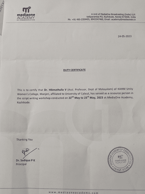 Dr.Hikmathulla V,Served as Resource Person in the Script writing workshop conducted by Media one Academy, Kozhikode on 22-23/05/2023