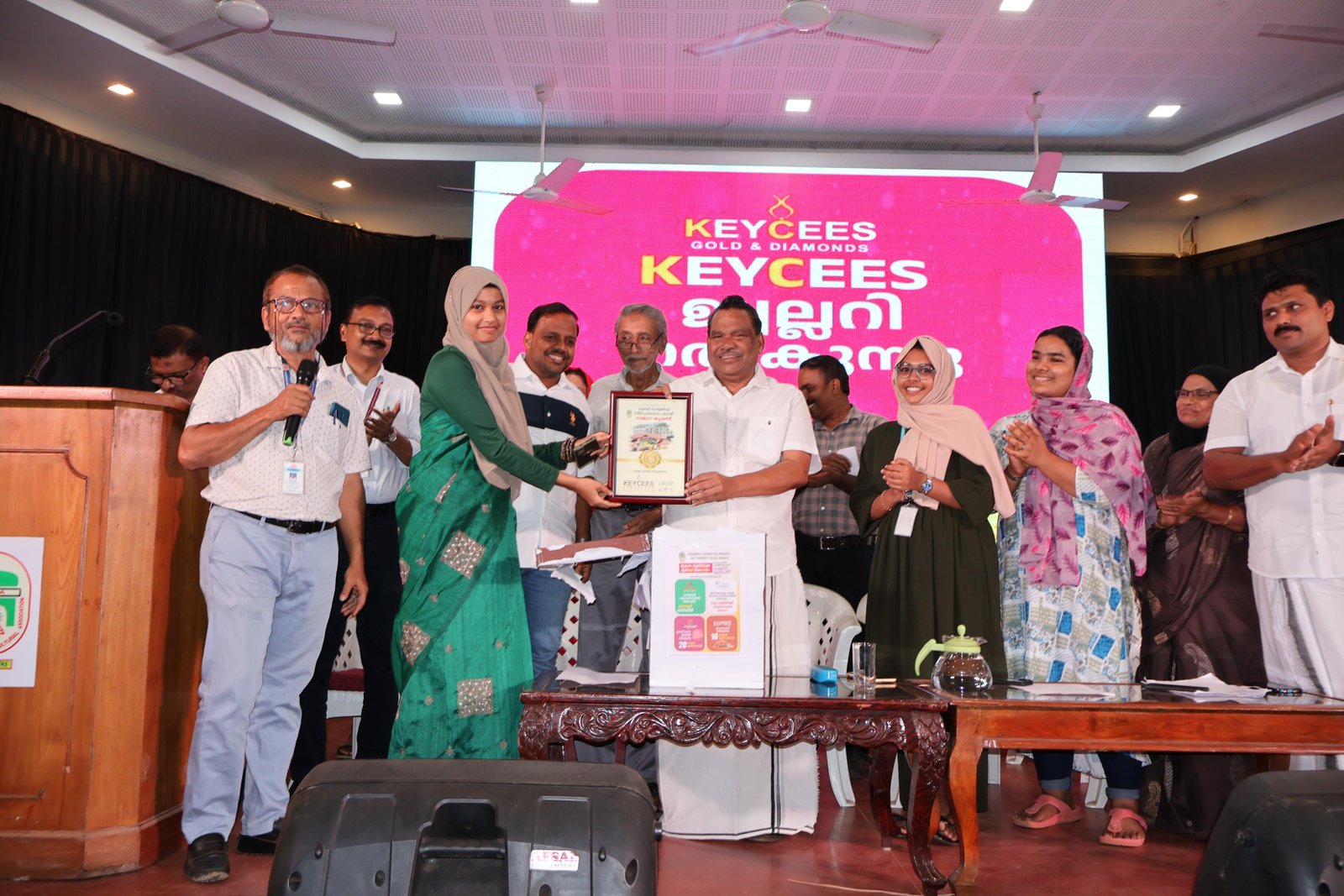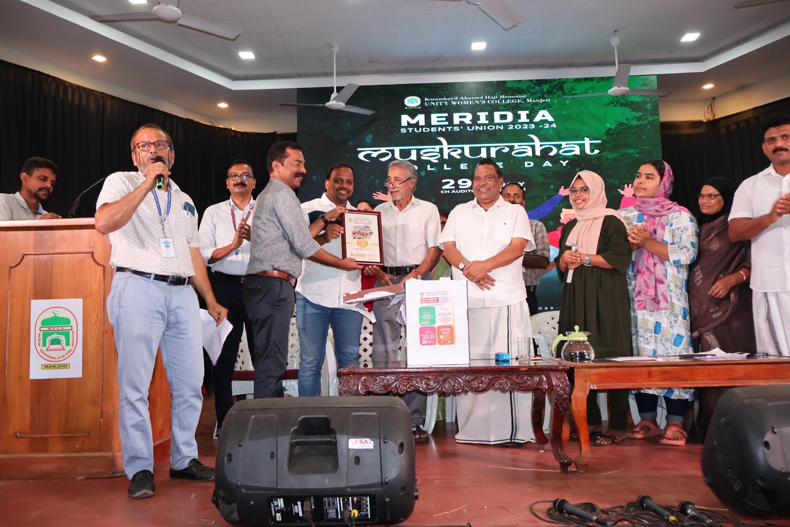 The welcome address was given by Ms. Fahmida, Joint Secretary. The presidential address was delivered by the College Chairperson Ms. Aslaha Konoth. Principal, Prof. (Dr.) Muhammed Basheer Ummathur presented the College Annual Report showcasing the laurels and academics, co-curricular and extra curricular activities of the academic year 2023-24. This was followed by the lucky draw prizes in association with “Snehabhavanam – a project undertaking housing construction for the needy student”. The prizes were sponsored by KeyCees Jewellery, Bidon bycycle mall, TreeG Zelesta Resorts – Kakkadampoyil, Kasavu Kendra, Shawl Palace, K. R. Bakery, Cardea Health Care Solutions and Supernova. College Union report 23-24 was presented by Ms. Thasni, Union secretary.