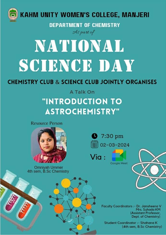 On March 2nd, 2024, in commemoration of National Science Day, the Chemistry Club of the Department of Chemistry and the Science Club collaboratively organized a stimulating talk on the fundamentals of Astrochemistry. The event, conducted via Google Meet at 7:30 PM, featured Ms. Omniyah Ummer, a knowledgeable and enthusiastic fourth-semester BSc. Chemistry student, as the resource person. The talk aimed to shed light on the intriguing intersection between chemistry and astronomy, exploring the composition, reactions, and processes occurring in the vast expanse of space. Ms. Ummer captivated the audience with her insightful explanations, delving into topics such as the formation of complex molecules in interstellar space and their role in the origins of life. Attendees were left with a newfound appreciation for the interdisciplinary nature of scientific inquiry and the wonders of the cosmos. The event served as an excellent platform for students and enthusiasts alike to engage in meaningful discussions and foster a deeper understanding of Astrochemistry.