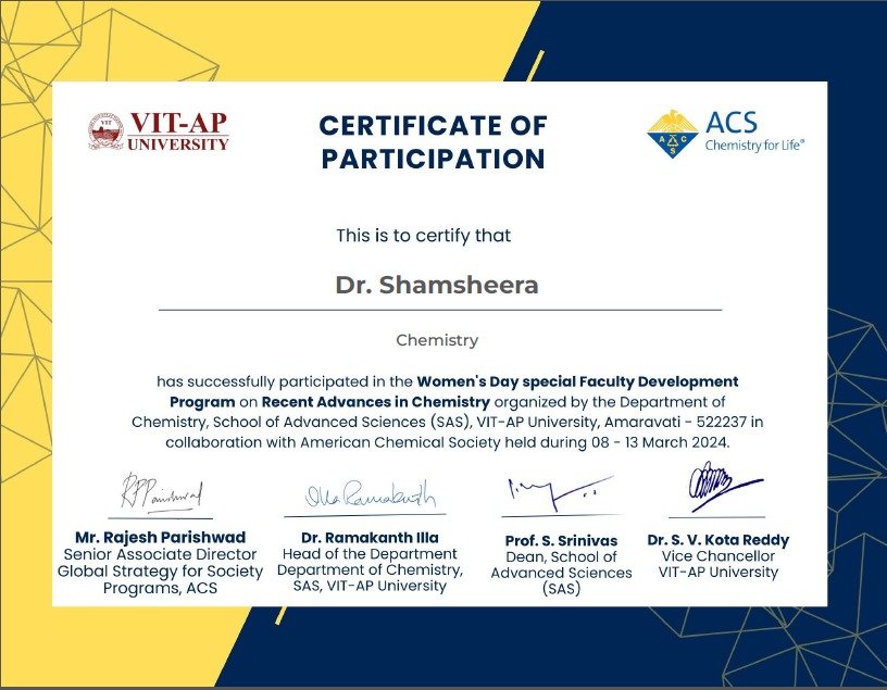 Dr. Shamsheera K O participated in the Women’s Day special Faculty Development Program on Recent Advances in Chemistry organized by the Department of Chemistry, School of Advanced Sciences (SAS), VIT – AP University, Amaravati in collaboration with American Chemical Society held during 08-13 March 2024