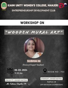 Ed Club organized a workshop on “Wooden Mural Art” on 6th March 2024 with the aim of providing the participants with hands-on experience and knowledge about the art of wooden mural creation. Mrs. Subha M, Fevicryl Expert Teacher was the Resource Person. Participants learned various painting techniques and methods for adding colour and texture to their wooden murals. Throughout the workshop, participants were encouraged to unleash their creativity and experiment with different styles and themes, resulting in a diverse range of wooden mural artworks. 40 members of the ED Club participated in the event. The program was inaugurated by Mr. TT Abdul Razak, the Head of Department of Commerce. It was co-ordinated by Ms. Fathima Shajitha and student co-ordinator Nafila CK.