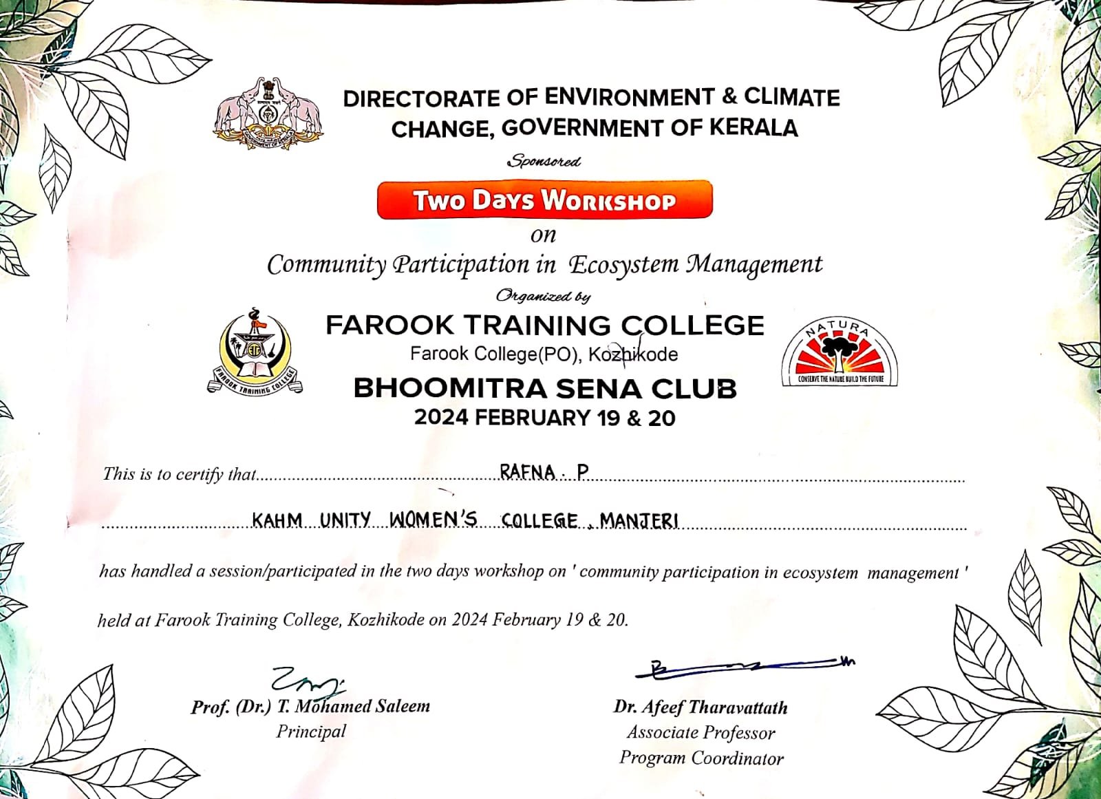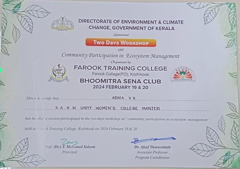 Eco & Nature club members, Arafa VK & Rafna P (2nd Sem BSc FCS) participated in Two days Workshop on Community Participation in Ecosystem Management conducted by Bhoomitra Sena Club, Farook Training College, Kozhikode on 19 & 20 February 2024.