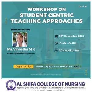 Ms. M. K. Vineetha, Assistant Professor, Department of English served as the resource person for the one day workshop on Student Centric Teaching Approaches for the staff of Al Shifa College of Nursing, Perinthalmanna on 5th December, 2023. The workshop explored the theoretical framework of SCTL (Student Centred Teaching and Learning) and the gaps between theory and practice, along with research findings on the potentials of the method. The interactive session incorporated simple strategies for student engagement and involvement, and touched upon innovative trends in teaching-learning- assessment dynamics, strongly emphasising the need for continuous professional and personal development to cope with the global technological advancements in all spheres of life.