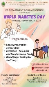 The PG department of Home Science celebrated ‘World Diabetes Day’ on 14/11/2023.The programme was inaugurated by Principal Prof.(Dr.). Muhammad Basheer Ummathur.As part of this, a full meal menu for a diabetic patient was displayed and this conveyed an idea of dietary management of Diabetis Mellitus.The foods with low& high glycaemic index was also displayed . Diabetic snack preparation competition for the students and blood sugar testing camp for teaching and non teaching staffs were also conducted .Around 25 staff members participated in the blood sugar test camp. Mrs. Noufiya Thasni, student of 1st sem MSc Home Science (Nutrition and Dietetics) has got first prize in snack preparation competition.The programme was coordinated by Mrs Shahla K, Assistant professor (Adhoc), and Mrs. Risba Sirin K, student of 1st sem MSc Home Science (Nutrition and Dietetics)